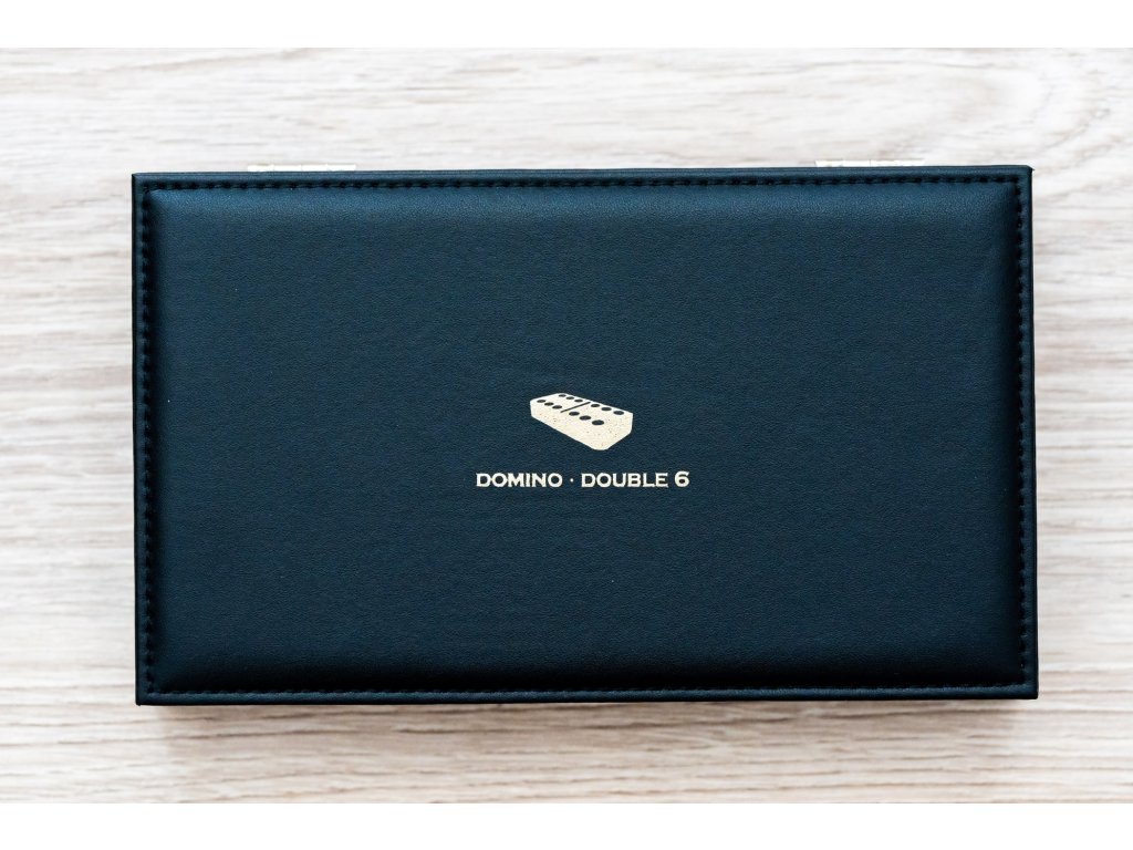 Material: Holzkiste mit Leder überzogen, Dominosteine aus gehärtetem Kunststoff