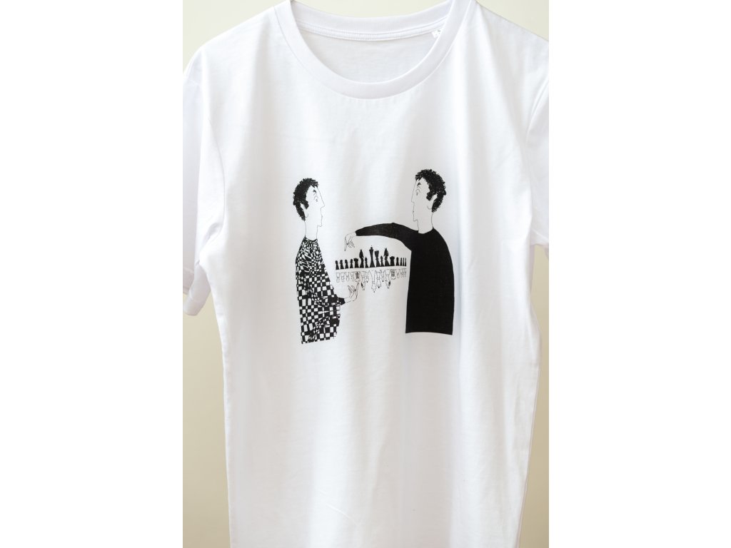 Weißes Unisex-T-Shirt aus Baumwolle, bedruckt mit einer Grafik aus der Vorderseite aus dem Buch Pod hladinou (Unterwasser) von GM Jan Markoš. Dieses T-Shirt garantiert Ihnen nicht nur ein angenehmes Tragegefühl, sondern auch eine unvergleichliche Originalität in der Schachgemeinschaft. Mit diesem T-Shirt werden Sie einfach beeindrucken!