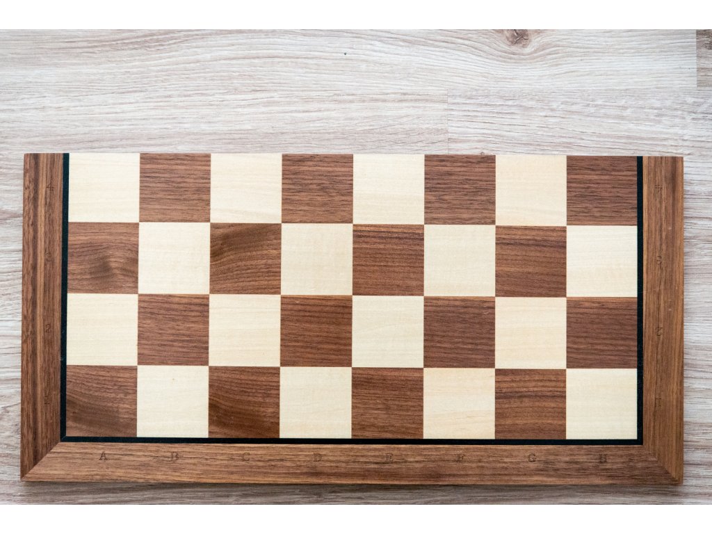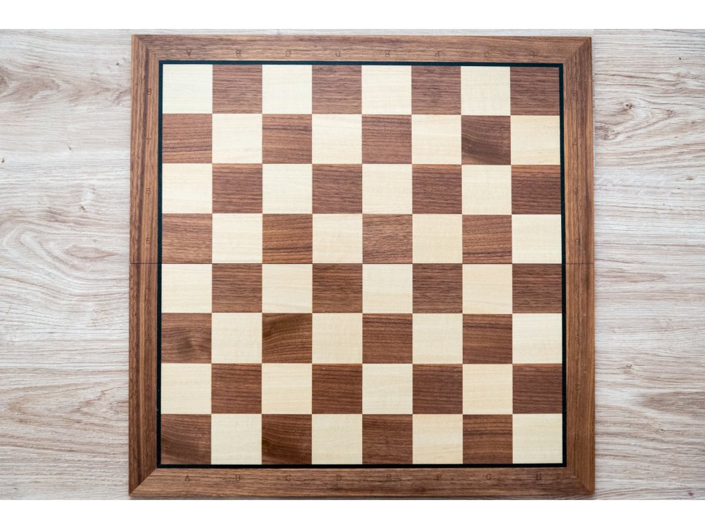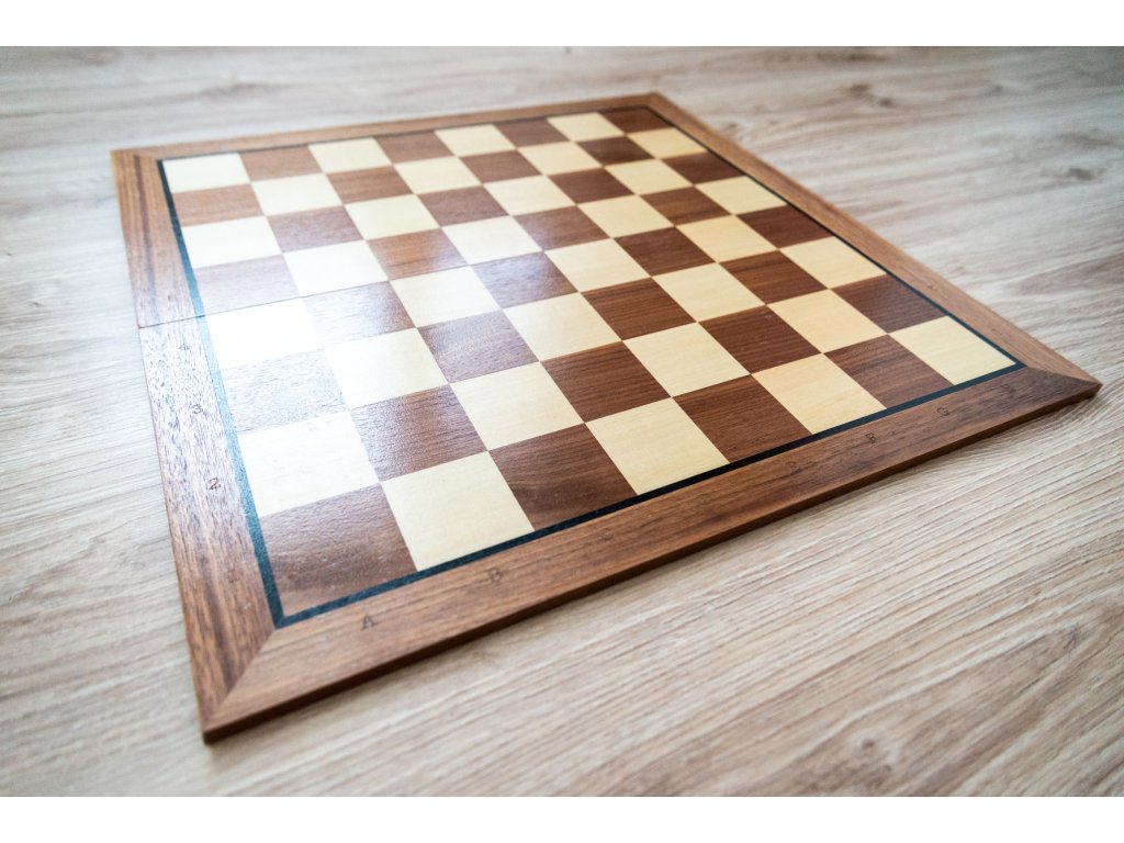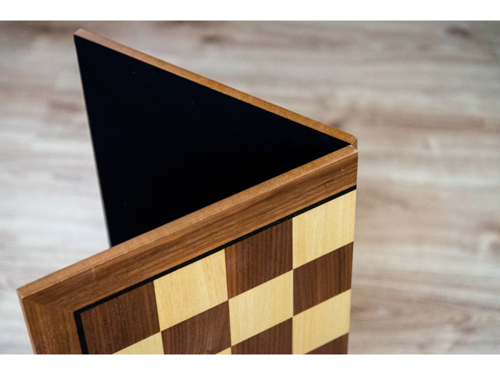 Klappbares Schachbrett aus Nussbaumholz in einer Größe, die sowohl für Wettkampfschach als auch für das Spielen zu Hause geeignet ist. Das Falten wird durch Verleimen erreicht, was mechanische Verbindungen wie Scharniere überflüssig macht und dem Schachbrett nach dem Öffnen ein kompaktes Aussehen verleiht.