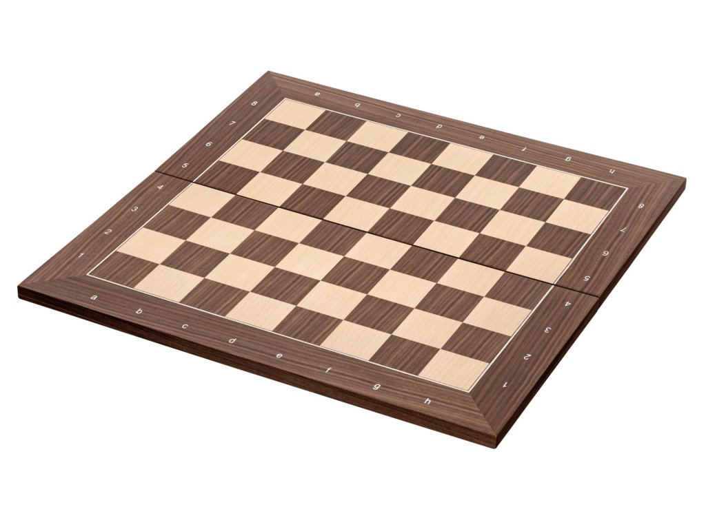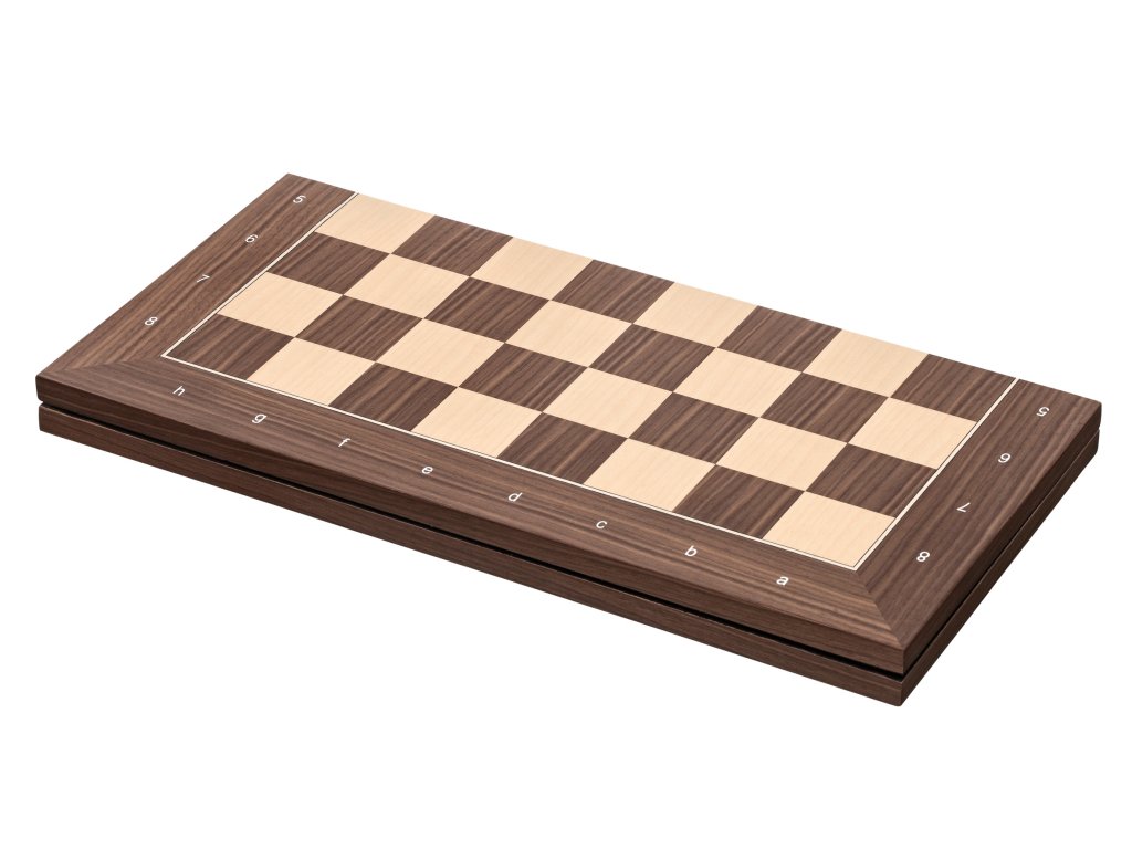 Klappbares Schachbrett aus Holz, mit Filzunterlage, um Abrieb zu verhindern. Das Klappgelenk ist sehr stark und durch eingebaute Metallscharniere gesichert.
