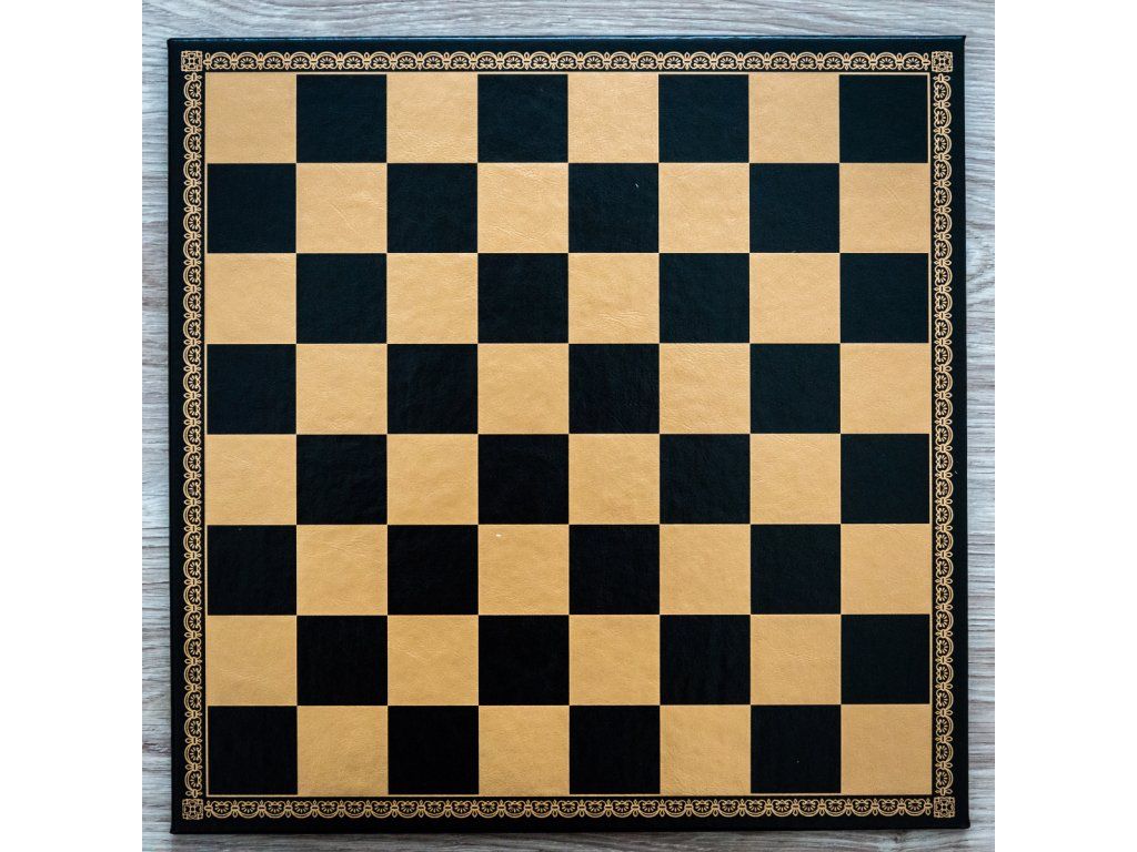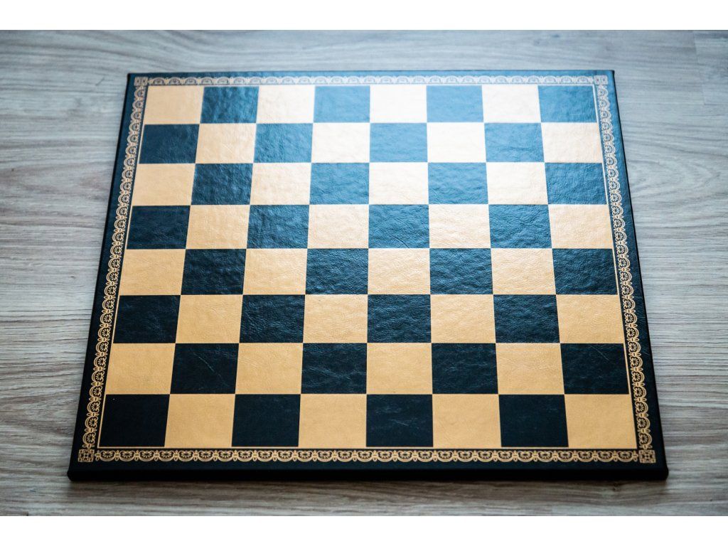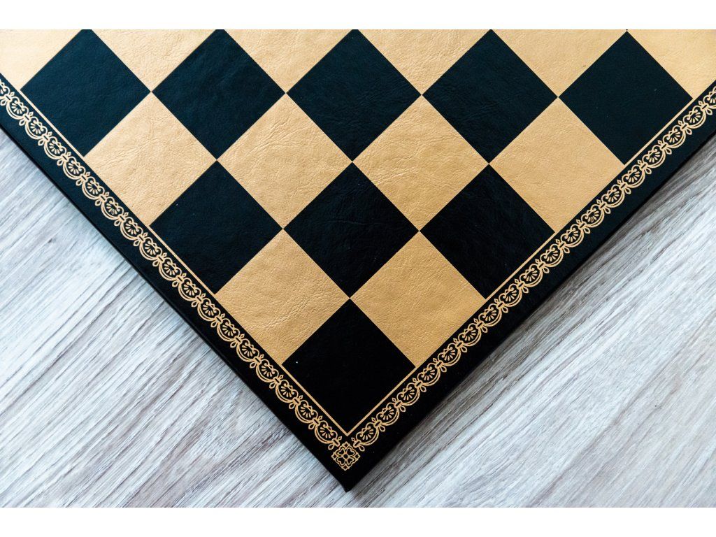 Ungewöhnliches Schachbrett, handgefertigt aus Holz und mit Kunstleder überzogen und mit goldenen Ornamenten an den Rändern verziert.
