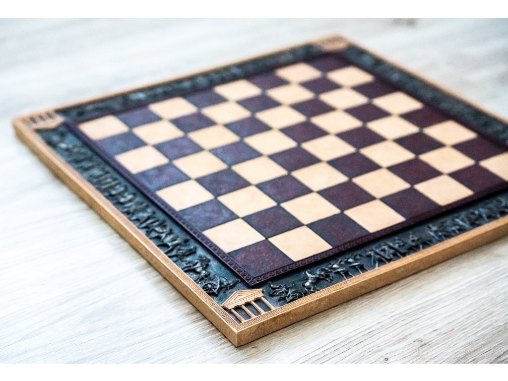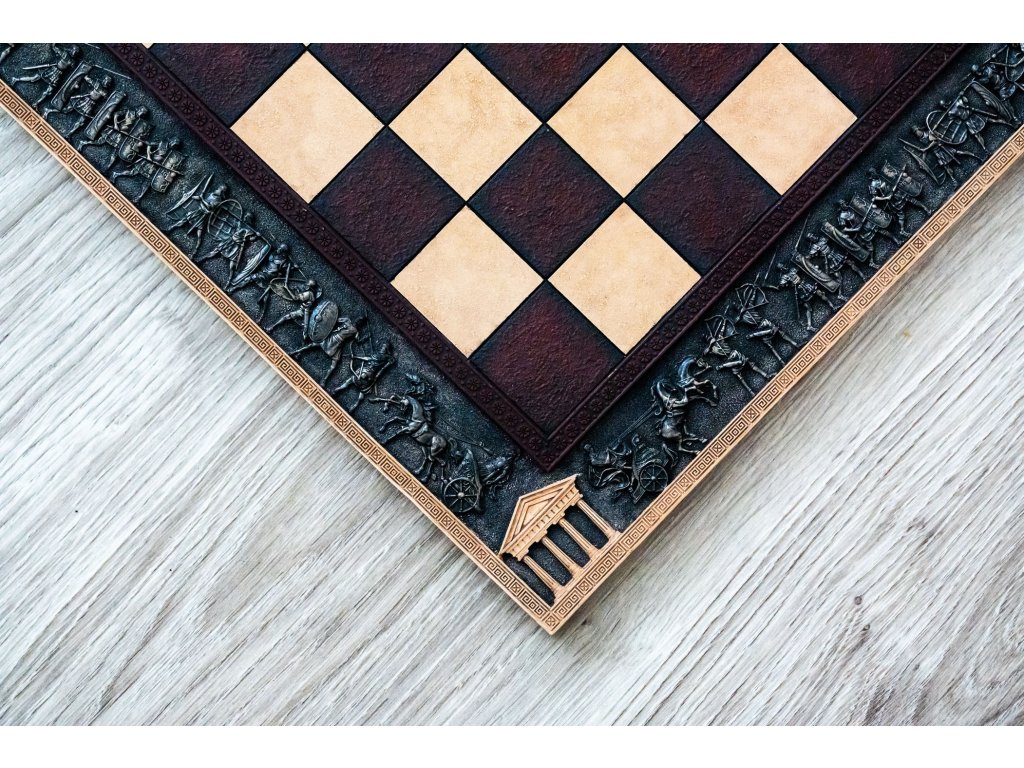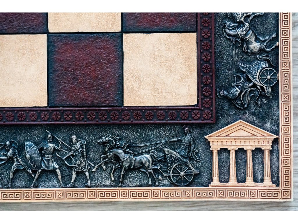 Schachbrett aus gehärtetem Harz und Metall. An den Seiten befindet sich eine dekorative Umrandung mit einem römischen Legionsmotiv. Handgefertigt.