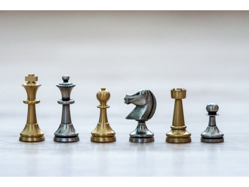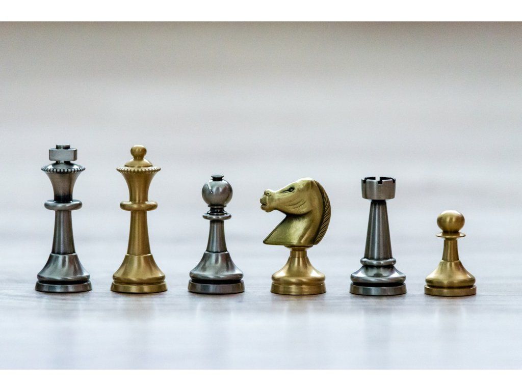 Schachfiguren aus Messing, die sich durch ihre Verarbeitung und ihr Gewicht auszeichnen und ein ungewöhnliches ästhetisches Erlebnis beim Schachspiel bieten.