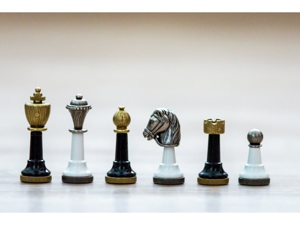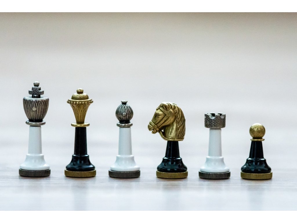 Schachfiguren aus Metall und lackiertem Holz mit Handverarbeitung. Die Schachfiguren sind ein geeignetes Geschenk zum Beispiel für runde Geburtstage, Schachkenner oder zu repräsentativen Zwecken.