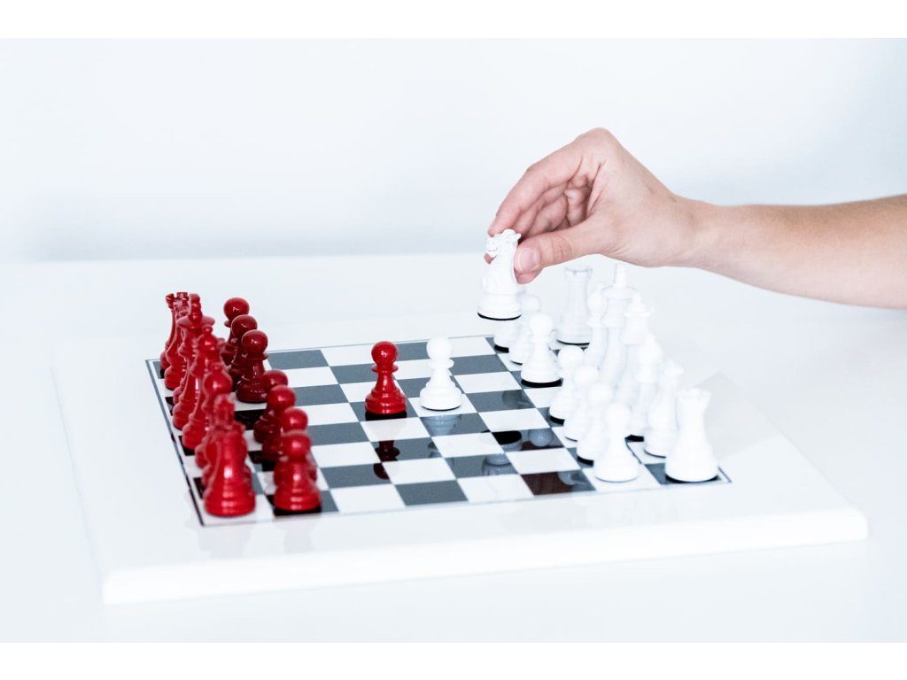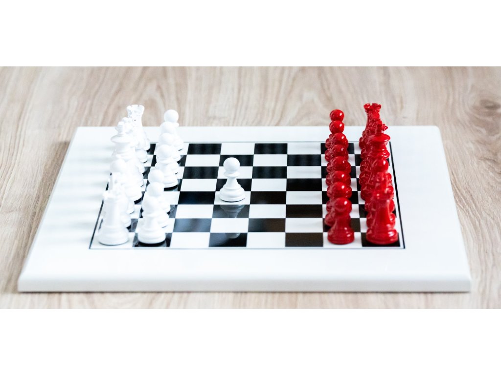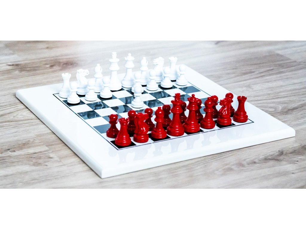 Interessantes Design von Schachfiguren aus Holz. Die weiß-rote Lackierung ist nicht nur für Sie, sondern auch für Ihre Umgebung immer ein Blickfang.