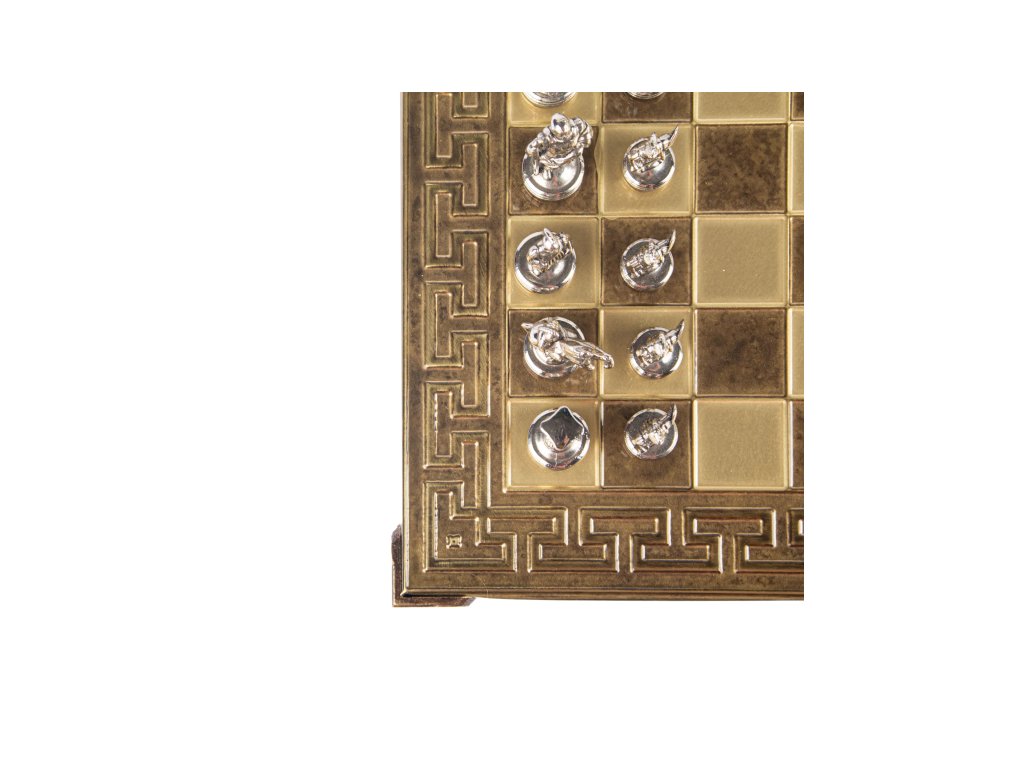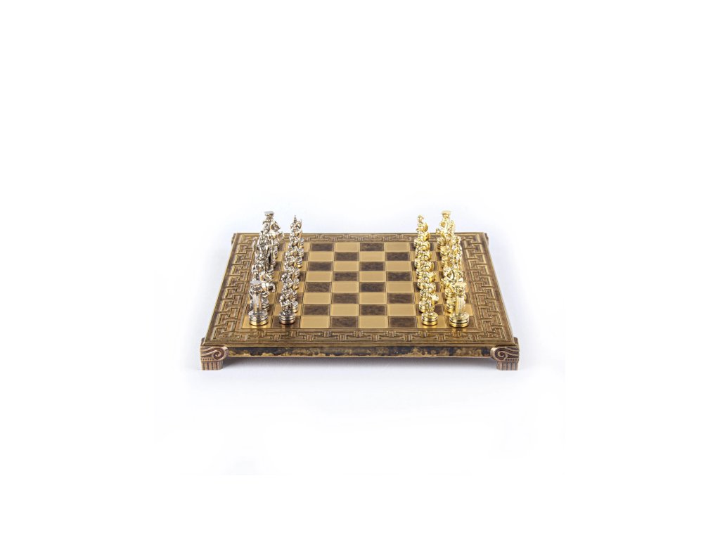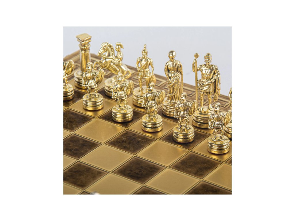Entdecken Sie die reiche Geschichte der antiken Reiche mit einem handgefertigten Schachspiel aus der griechisch-römischen Zeit. Dieses kleine, aber kunstvolle Set besteht aus goldenen und bronzenen Schachfiguren, die auf einem 28 x 28 cm großen Bronzeschachbrett wunderschön zur Schau gestellt werden und die Größe der griechischen und römischen Epochen zelebrieren.