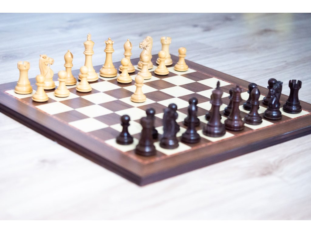 Luxus-Schachfiguren aus Palisanderholz, mit feiner Lederfilzunterlage für ein perfektes Erlebnis bei jedem Zug. Schachbrett aus Nussbaum und Platanenholz mit dekorativer Umrandung.