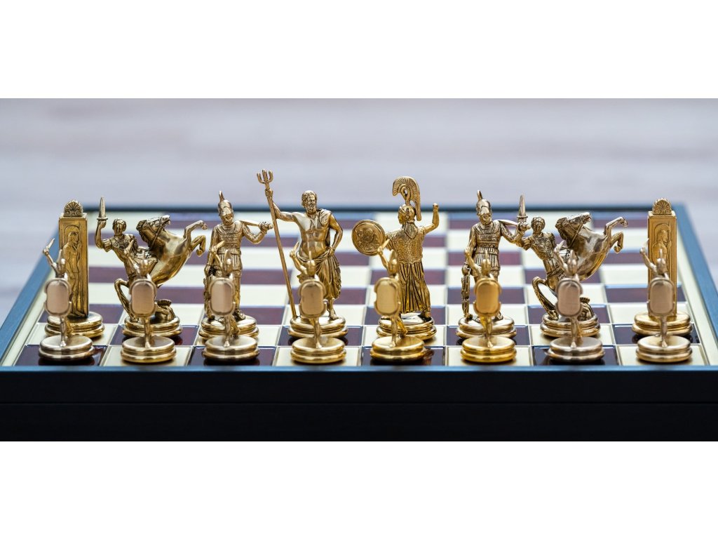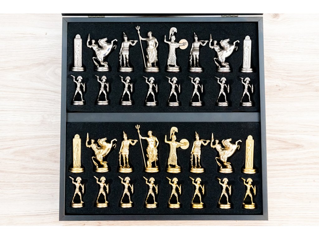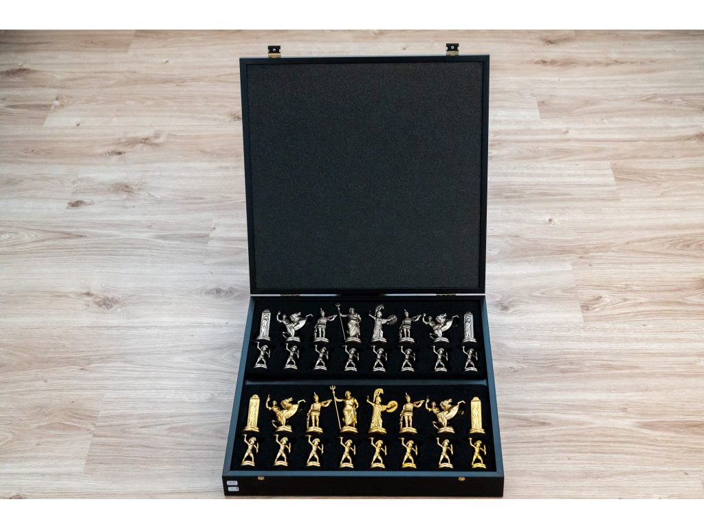 Genießen Sie die Erhabenheit der griechischen Mythologie mit dem exklusiven Schachset Griechische Mythologie, das jetzt in einem eleganten Holzkoffer erhältlich ist. Dieses handgefertigte Set besteht aus wunderschönen goldenen und silbernen Schachfiguren, die jeweils legendäre Figuren aus der antiken griechischen Mythologie abbilden. Ergänzt wird das Set durch ein atemberaubendes Schachbrett aus Bronze mit der Größe von 48 x 48 cm, das eine große und luxuriöse Spielfläche bietet.