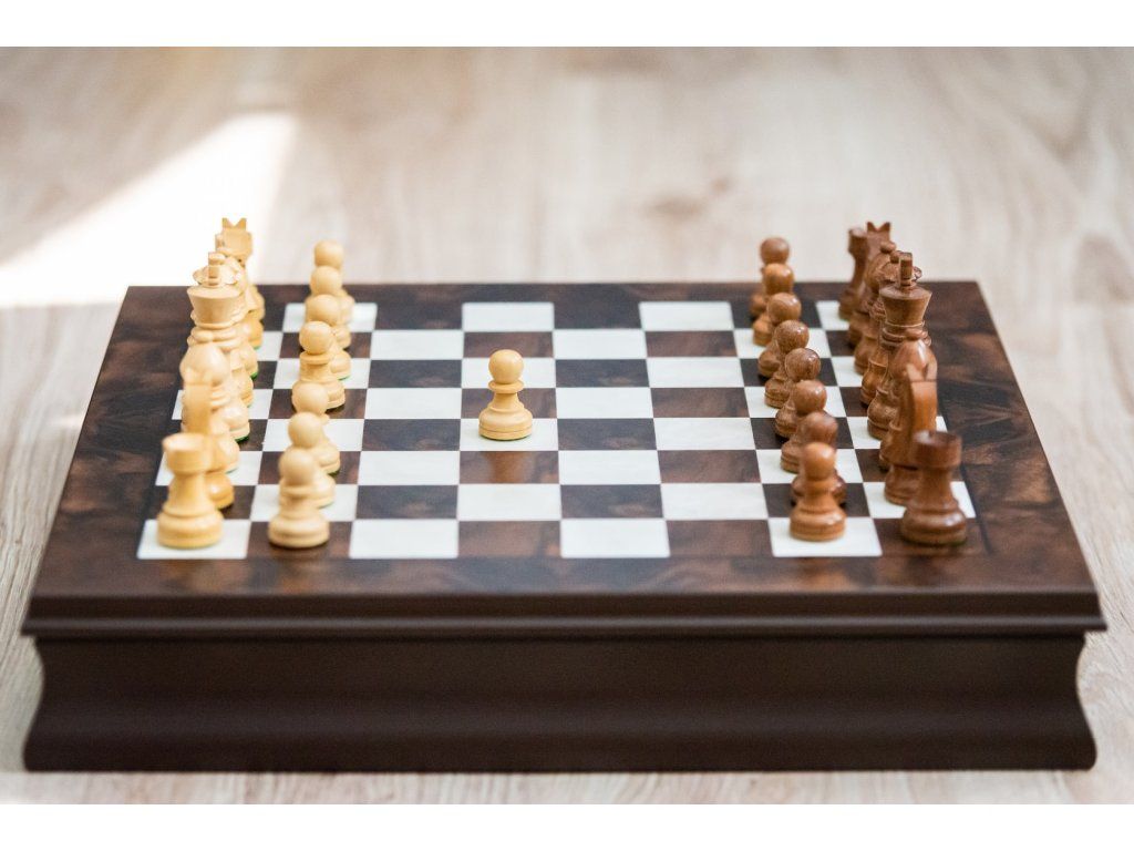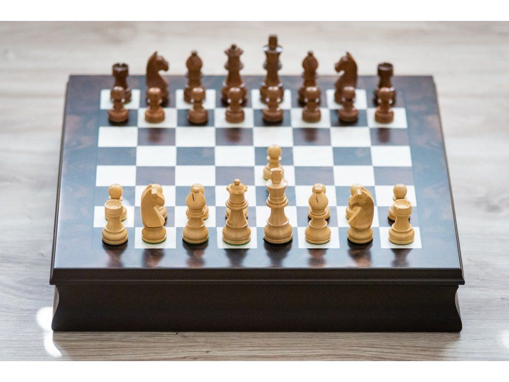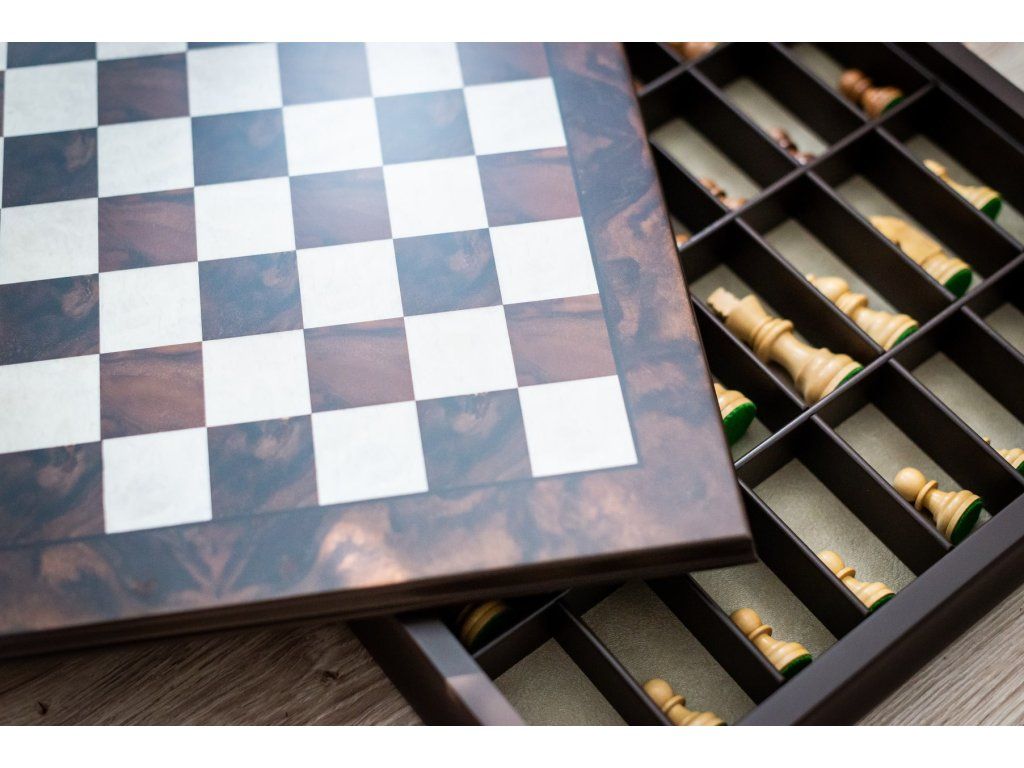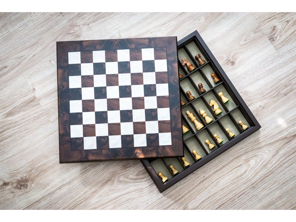 Das Schachbrett besteht aus zwei Teilen. Einem Schachbrett und einem Stauraum für die Figuren.