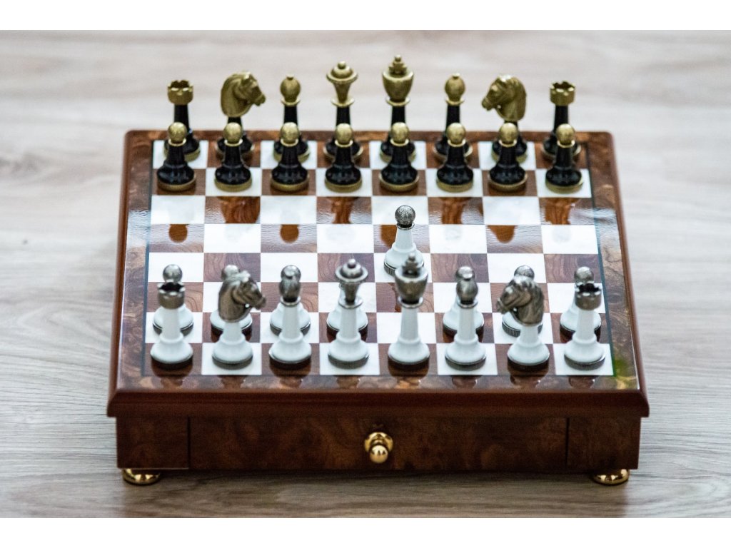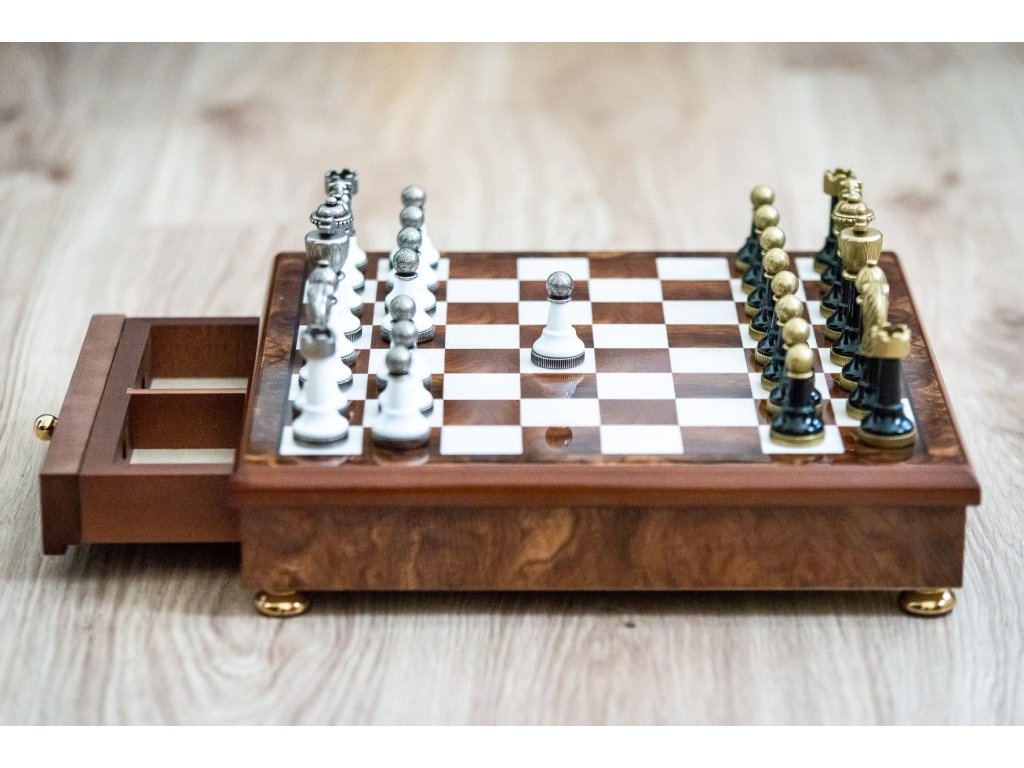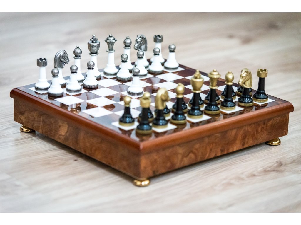 Schachfiguren aus Metall und lackiertem Holz mit Handarbeit. Die Schachfiguren sind ein geeignetes Geschenk zum Beispiel für runde Geburtstage, Schachliebhaber oder zu Repräsentationszwecken.