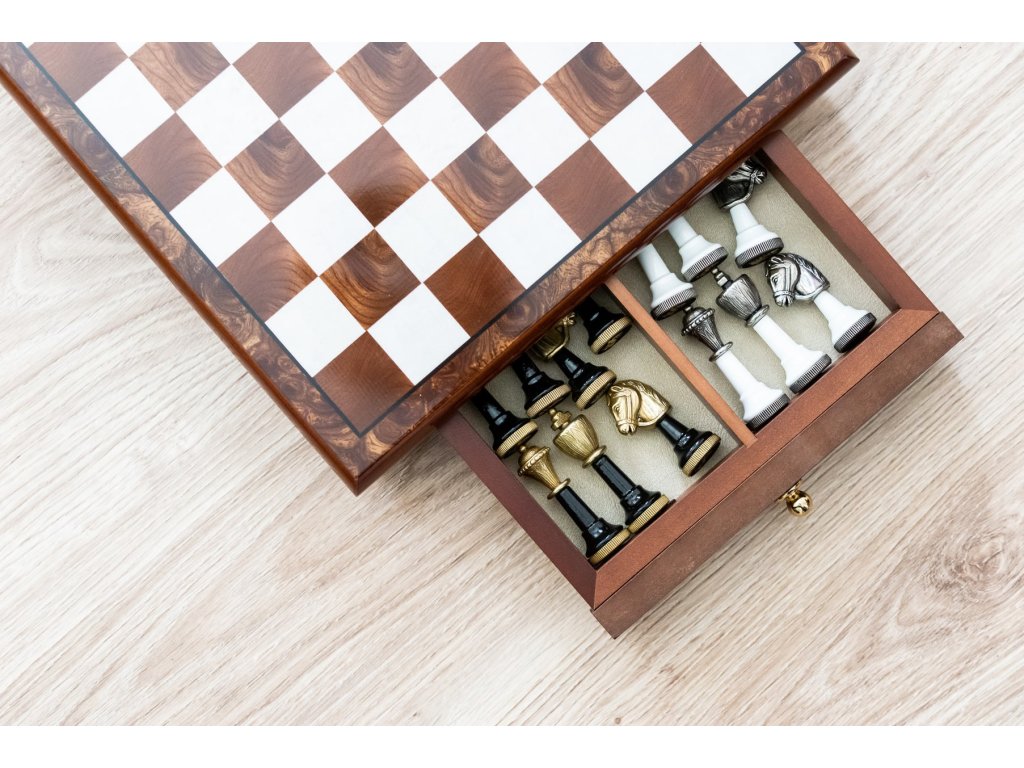 Das Schachbrett enthält ein einziehbares Aufbewahrungsfach für die Figuren.