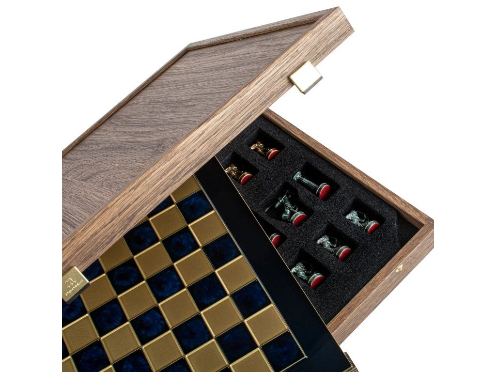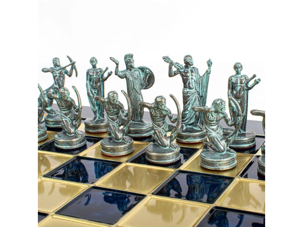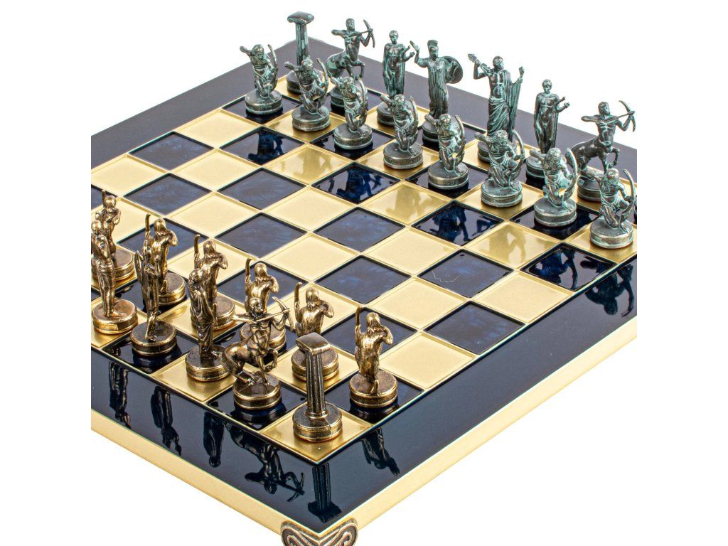 Betreten Sie die Welt der antiken griechischen Mythologie mit dem handgefertigten Schachset Hercules. Dieses mittelgroße Set enthält goldene und silberne Schachfiguren auf einem bronzenen Schachbrett von 36 x 36 cm und feiert die legendären Geschichten und heldenhaften Taten des Herkules.
