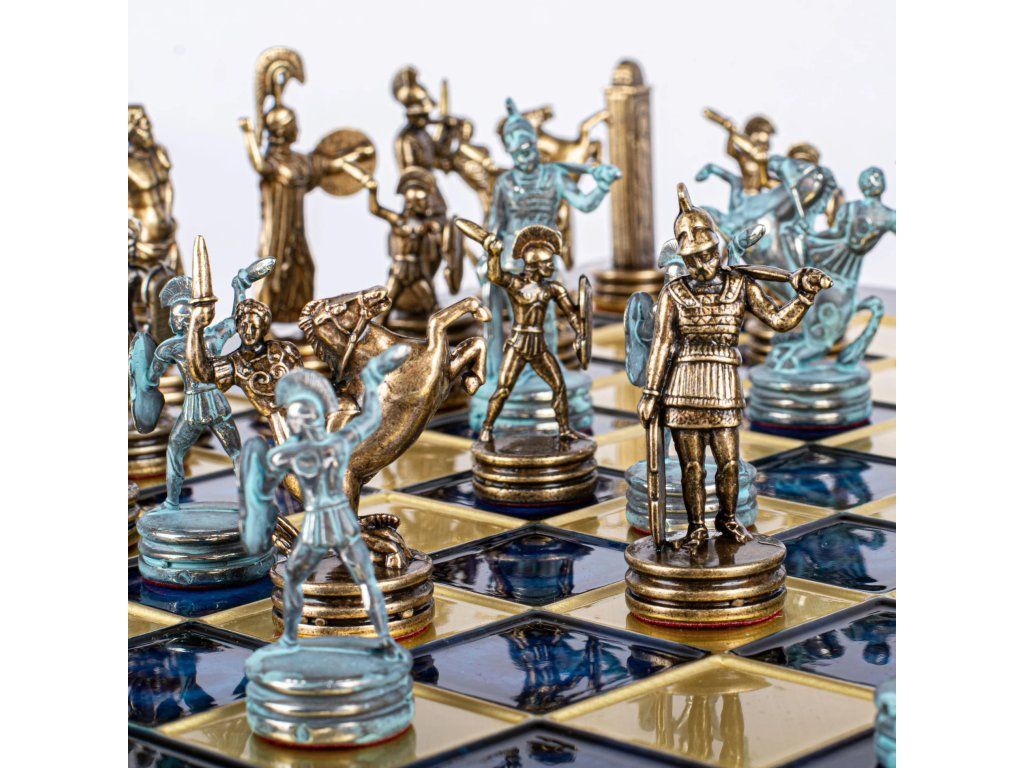 Betreten Sie die Welt antiker Legenden mit unserem handgefertigten Schachset, das kunstvoll gestaltete blaue und braune Schachfiguren enthält. Dieses prachtvolle Set erweckt die Helden und Götter der griechischen Mythologie auf einem beeindruckenden bronzenen Schachbrett von 36 x 36 cm zum Leben. Jede Figur ist mit Liebe zum Detail gefertigt, was dieses Set zu einem echten Kunstwerk macht.