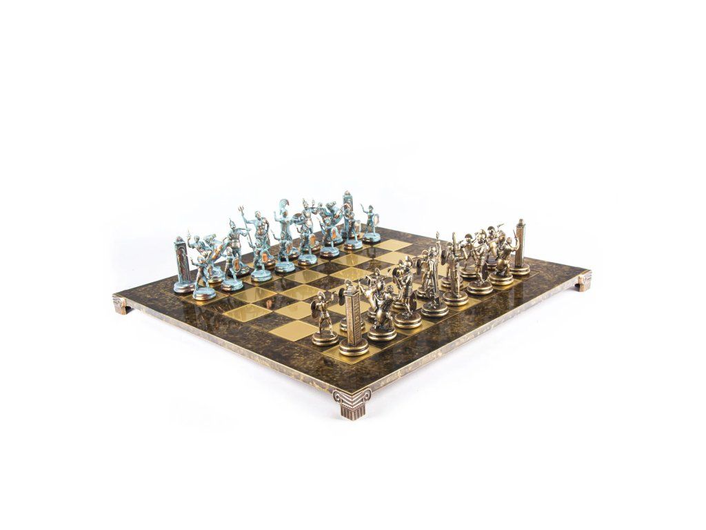 Griechische Bildhauer stellten diesen göttlichen Konflikt gern in ihrer Kunst dar. Der König ist eine Nachbildung der berühmten Statue „Poseidon von Melos“ (2. Jahrhundert v. Chr.), und die Dame stellt die berühmte „Athena Promachos“ dar (450 v. Chr., Akropolismuseum). Eine bronzene hellenistische Statue inspirierte den Läufer, und der Springer ist Teil der Marmorfassade des Parthenon, die von Phidias geschaffen wurde. Der Turm ist eine Reproduktion einer der bewundernswertesten attischen Stelen, die dem im Kampf gefallenen jungen Aristion gewidmet sind. Schließlich ist der Bauer eine Bronzestatue eines voll bewaffneten Soldaten aus dem Jahr 500 v. Chr.