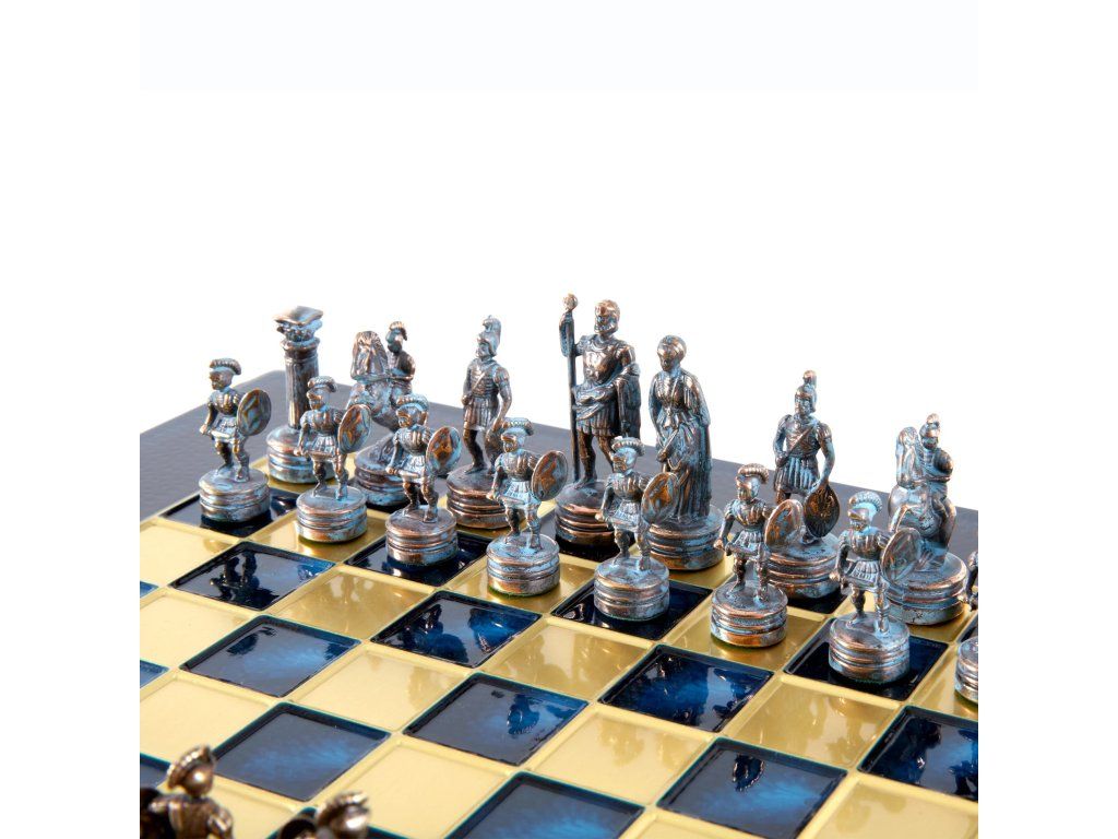 Tauchen Sie mit diesem handgefertigten Schachset aus der griechisch-römischen Epoche in die reiche Geschichte antiker Reiche ein. Dieses kleine, aber raffinierte Set enthält blaue und bronzene Schachfiguren, die wunderschön auf einem bronzenen Schachbrett von 28 x 28 cm arrangiert sind und die Größe der griechischen und römischen Ära feiern.