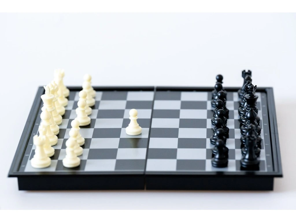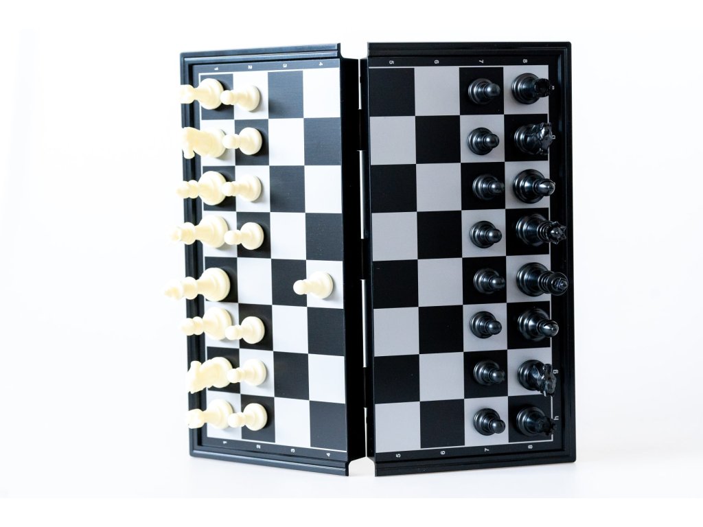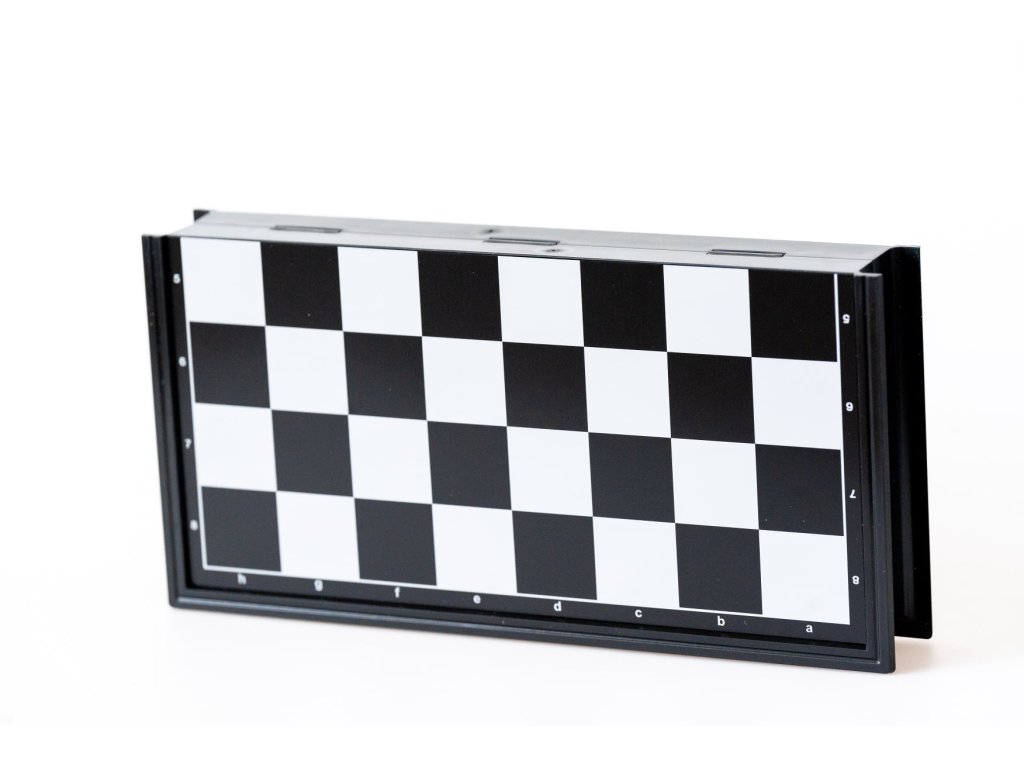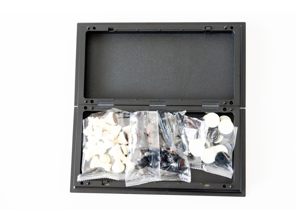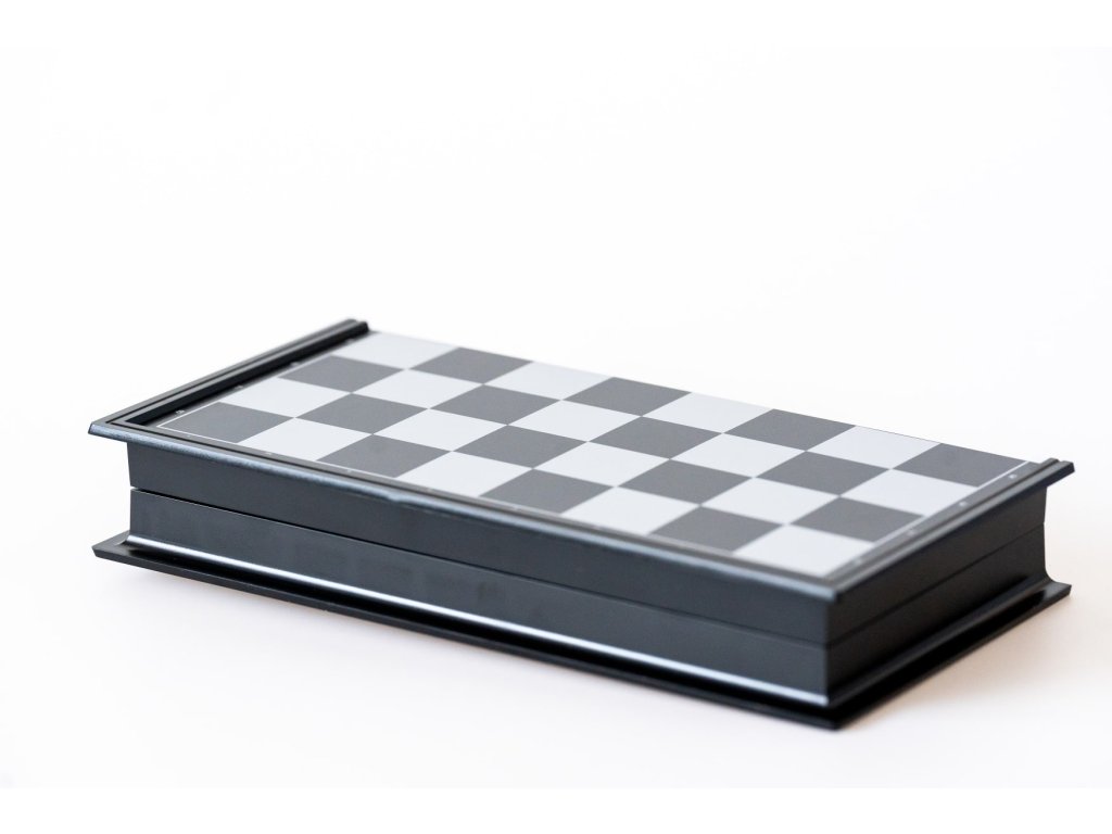 Das Travel Chess Set ist ein kleines Set mit einem aufklappbaren Kunststoffgehäuse mit Scharnieren, das sich zu einem 230 x 230 mm großen Schachbrett mit 28 mm großen schwarzen und weißen Feldern öffnet.