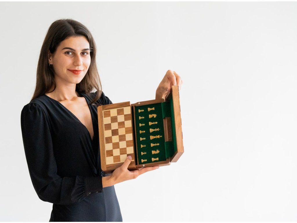 Magnetisches Schachspiel in einer klappbaren Kassette. Die Figuren sind sicher im Inneren des Schachbretts aufbewahrt, und das Schachspiel kann schnell zusammengeklappt werden. Durch die Aufbewahrung im Inneren des Schachbretts wird garantiert, dass die Figuren nicht verloren gehen.