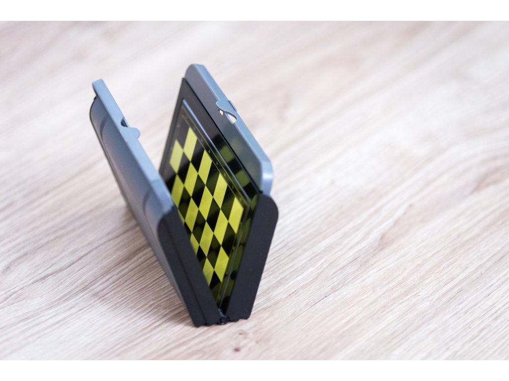 Magnetisches Schachspiel, das aufgrund seiner Größe praktisch für Reisen ist. Zusammengeklappt ist es so groß wie ein Brillenetui. Ein starker Magnet in den Figuren sorgt dafür, dass sie fest mit dem Schachbrett verbunden sind.