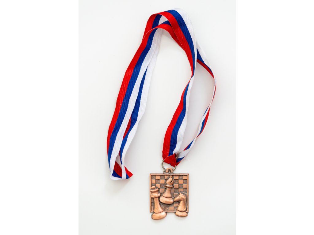 Bronzemedaille für Gewinner von Schachwettbewerben. Die Medaille ist schon komplett mit einem Band. Auf der Rückseite können Informationen über die Veranstaltung geklebt werden.