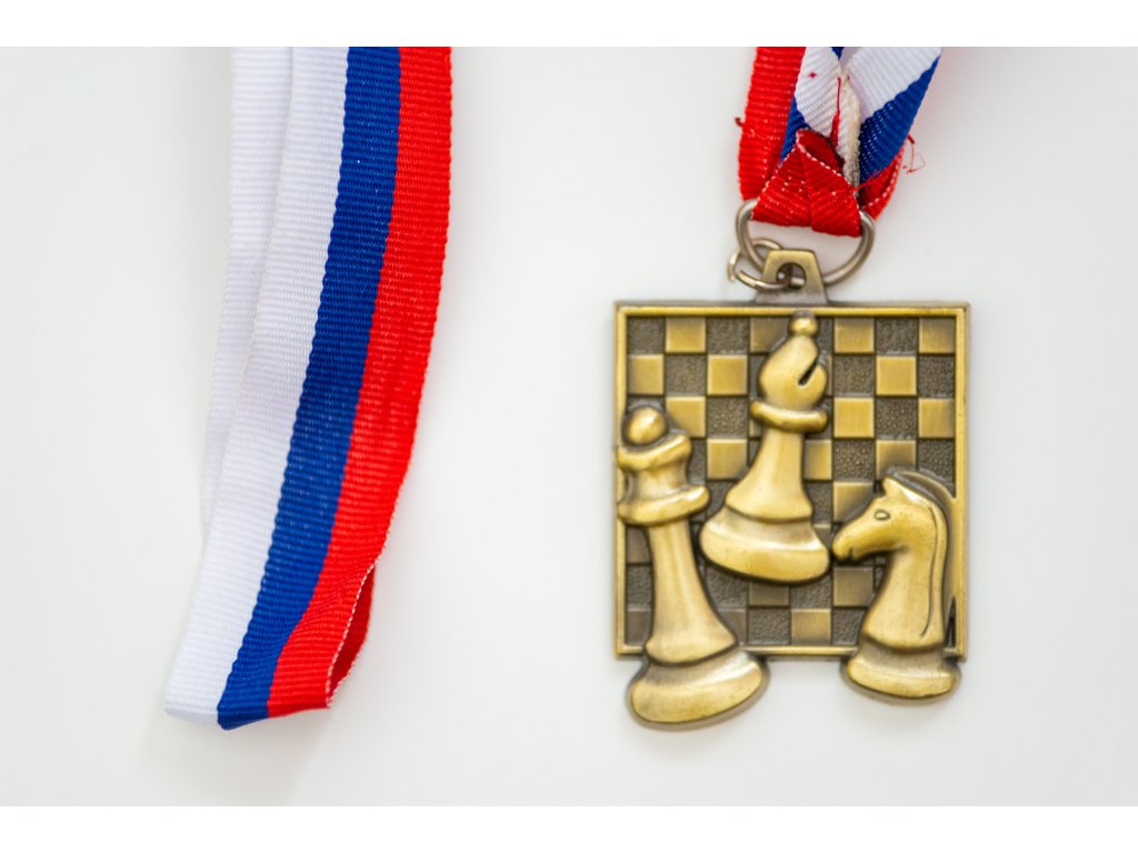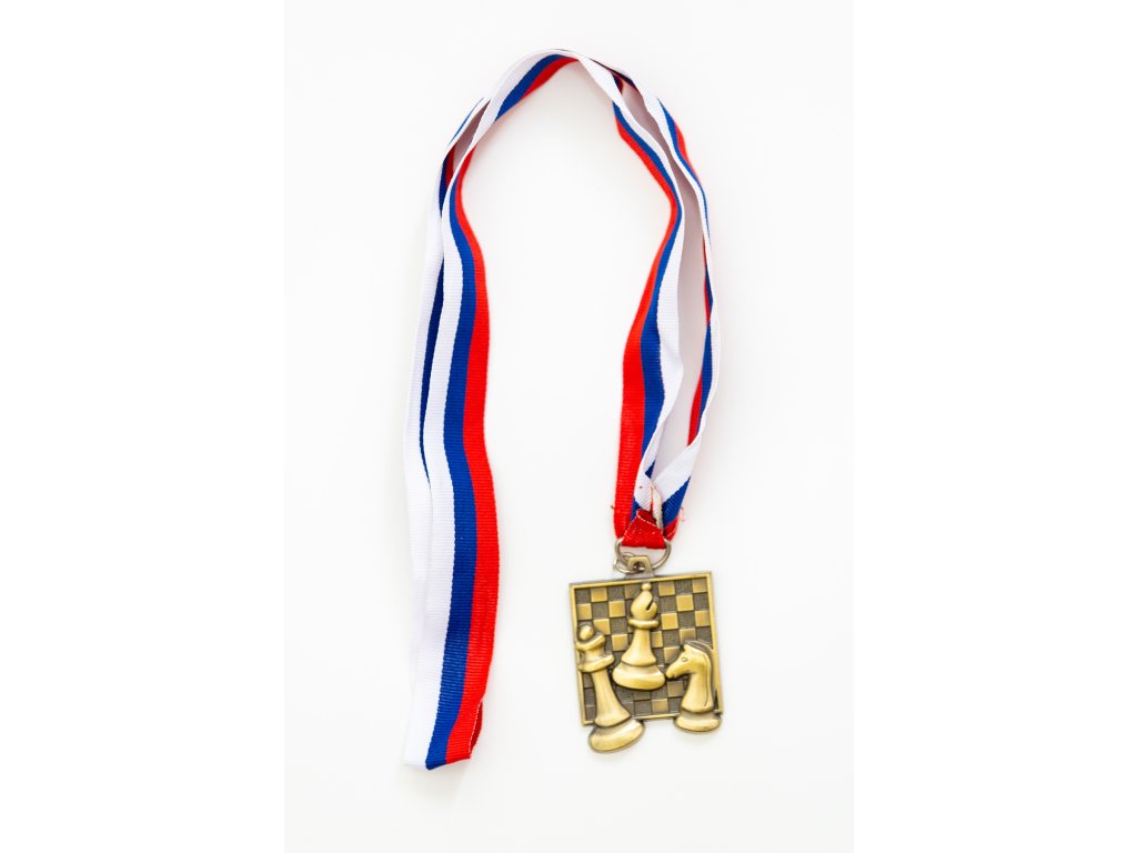 Goldmedaille für Gewinner von Schachwettbewerben. Die Medaille ist schon komplett mit einem Band. Auf der Rückseite können Informationen über die Veranstaltung geklebt werden.