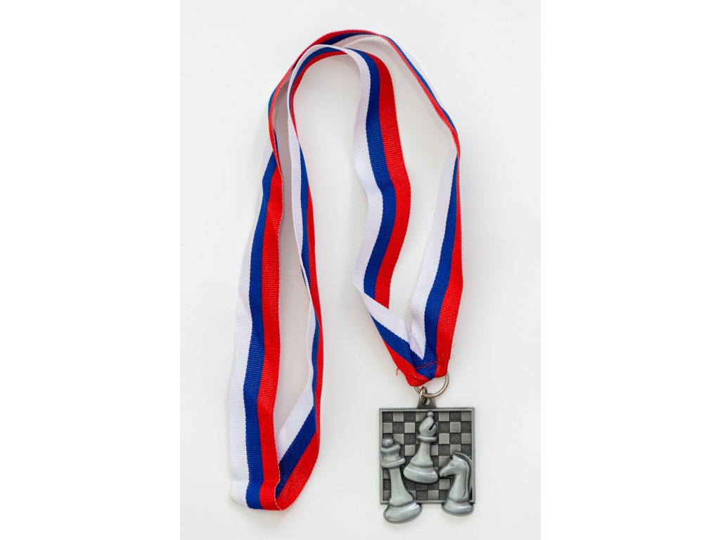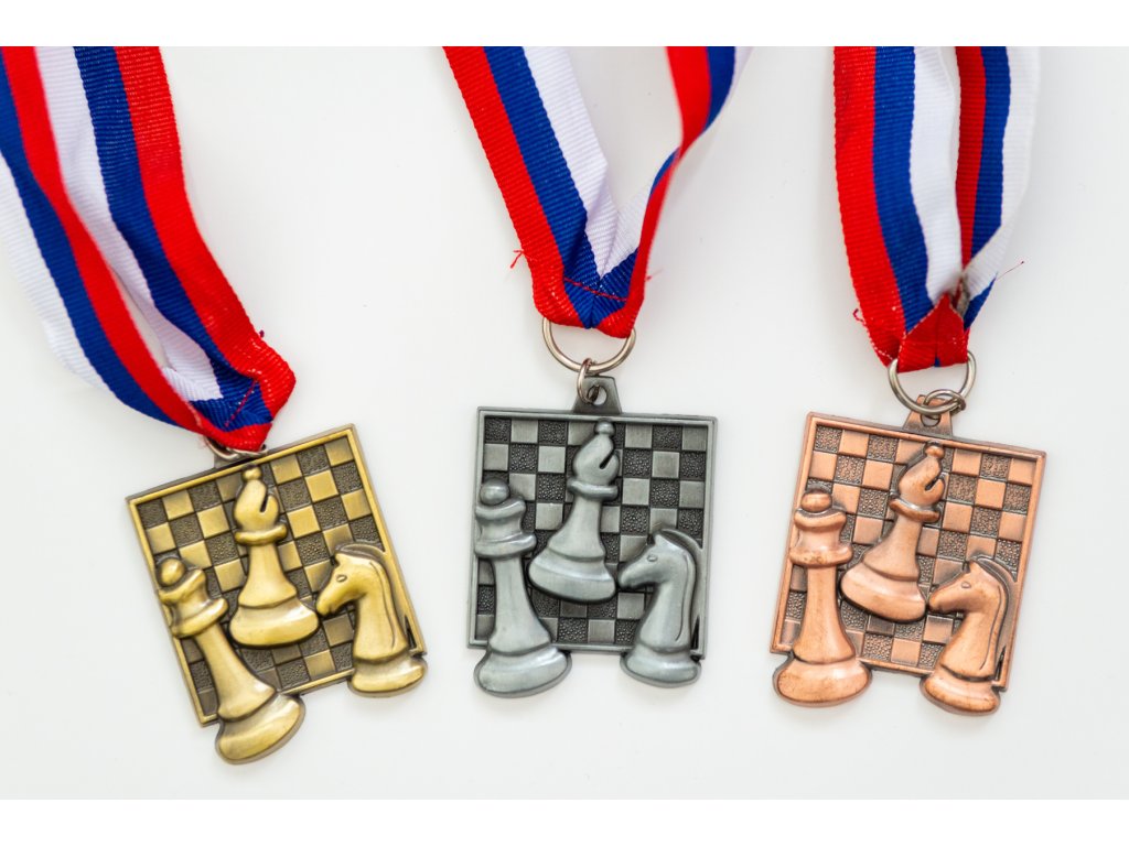 Set von drei Medaillen - Gold, Silber und Bronze für Gewinner von Schachwettbewerben. Die Medaille ist schon komplett mit einem Band. Auf der Rückseite können Informationen über die Veranstaltung geklebt werden.