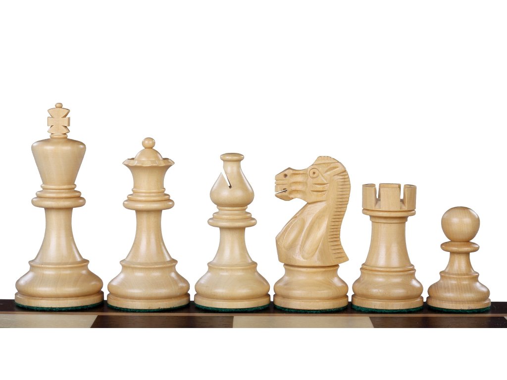 Eine beliebte Version der Staunton-Figuren in luxuriösem Akazienholzausführung, ausgeglichen mit einem weichen Sockel in einer Standard-Turniergröße.