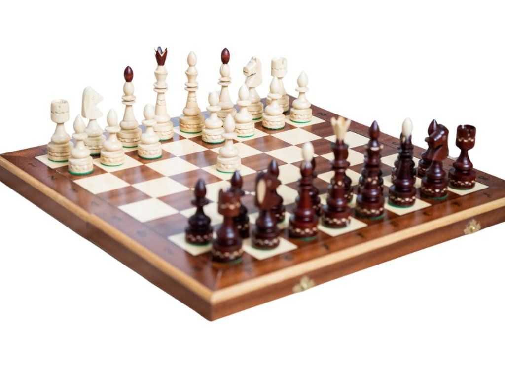 Liebevoll hergestelltes Holzschachspiel aus Eiche und Ahorn mit Schnitzereien rund um den Rand der Figuren.