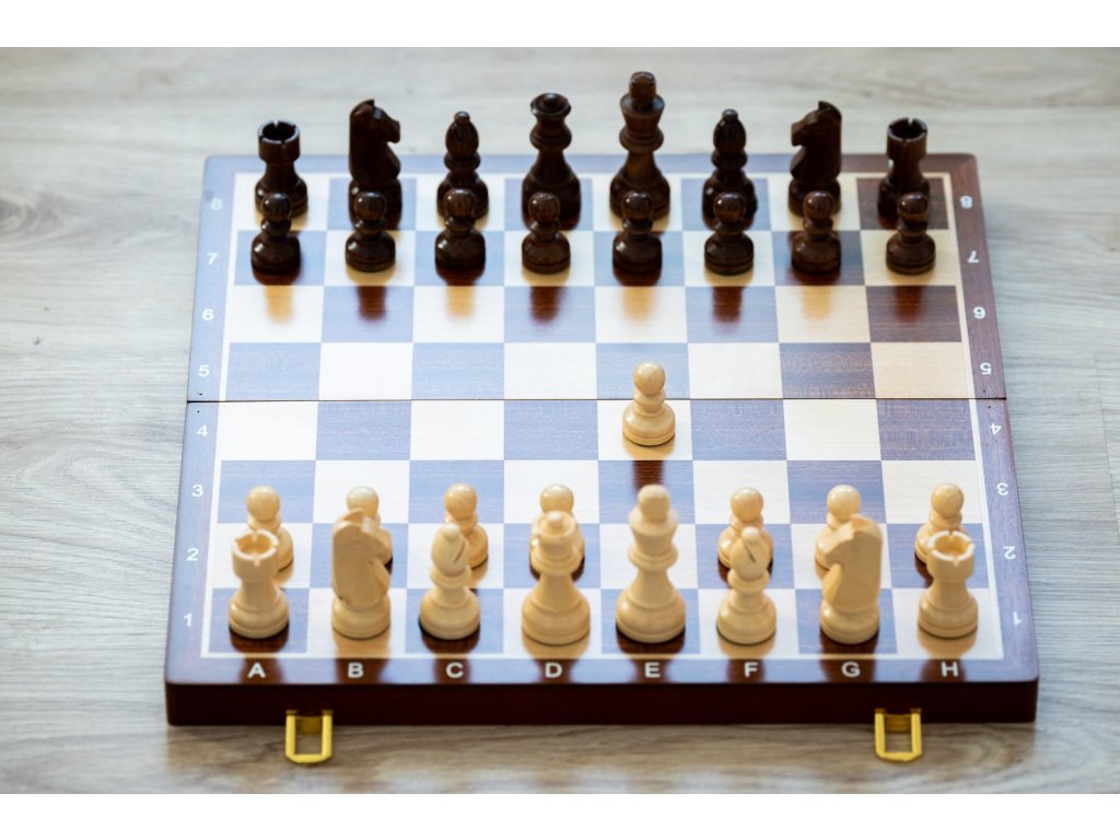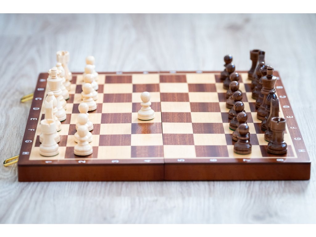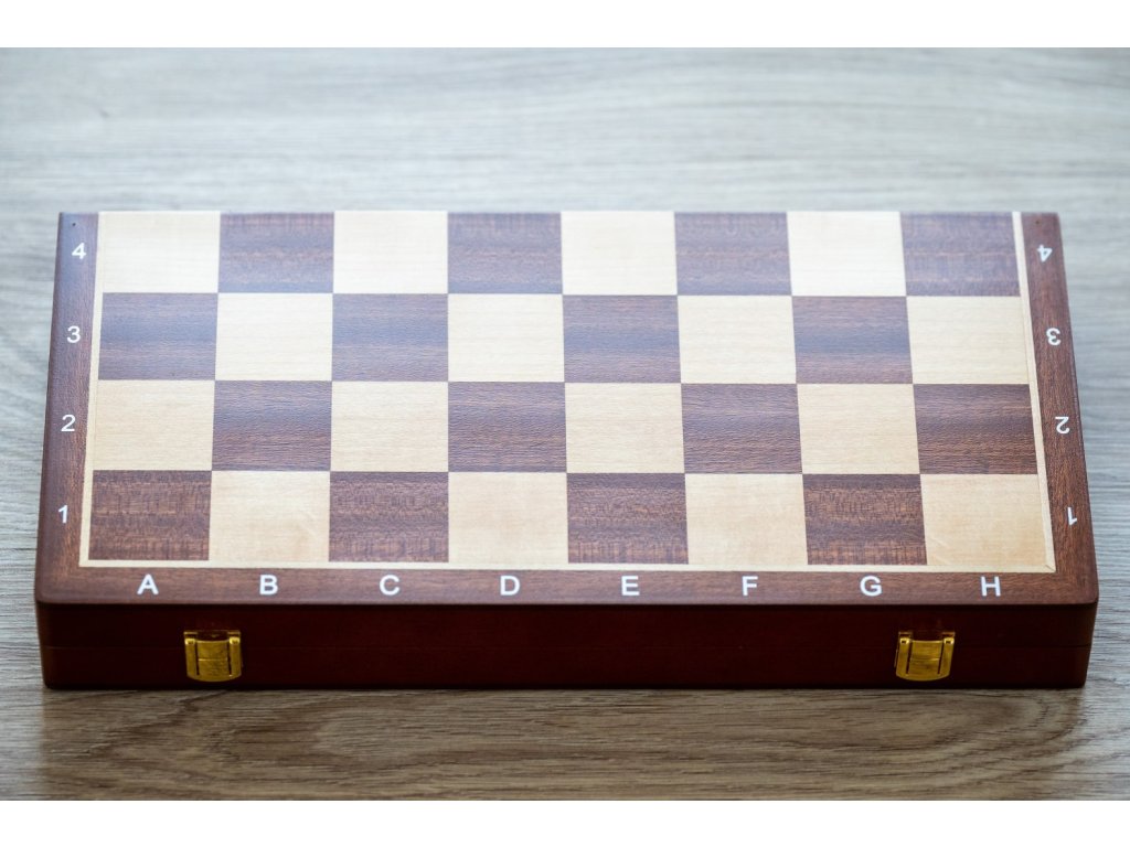 Ein beliebter Typ eines hölzernen Schachspiels in einem verschließbaren Kasten. Das Schachbrett enthält Notation - Markierung von Zahlen und Buchstaben zur besseren Orientierung auf dem Schachbrett. Die Holzfiguren werden im Inneren aufbewahrt. Jede hat ihren eigenen Platz, so dass sie nicht beschädigt werden können.