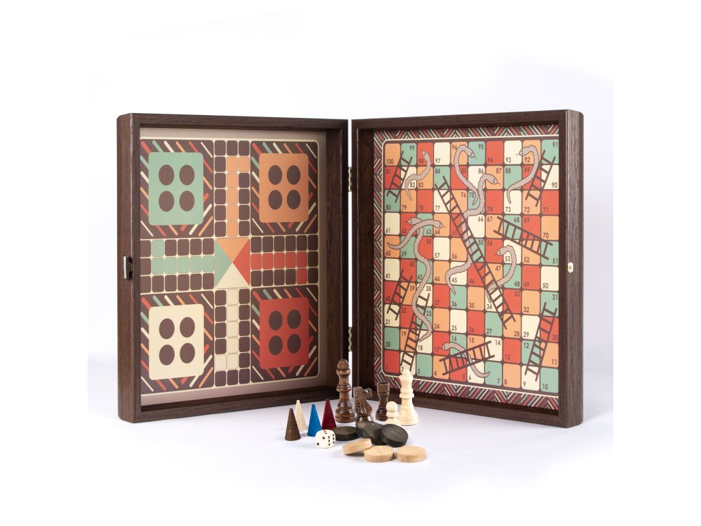 Genießen Sie vier klassische Spiele in einem Set: Schach, Backgammon, Ludo und Schlangen, die für endlosen Spaß und Abwechslung bei Spieleabenden sorgen.