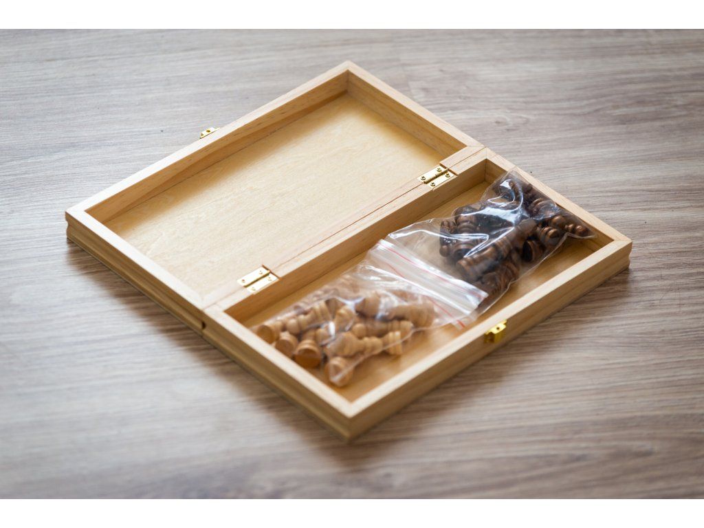 Holzschachspiele ECO sind die einfachsten Schachspiele, die jedoch vollständig aus Holz hergestellt sind. Der Vorteil ist die Umhüllung des Schachbretts mit der Lagerung der Figuren im Inneren und einem abschließbaren Mechanismus. Sie ist sehr platzsparend in der Wohnung.