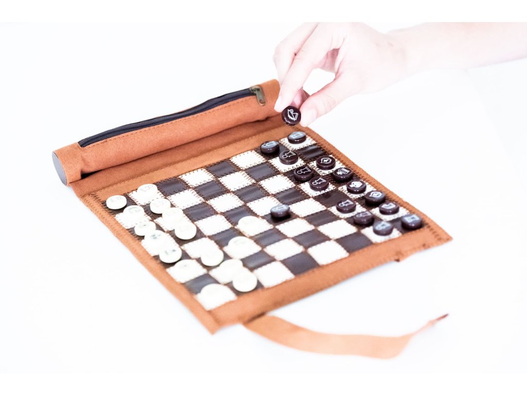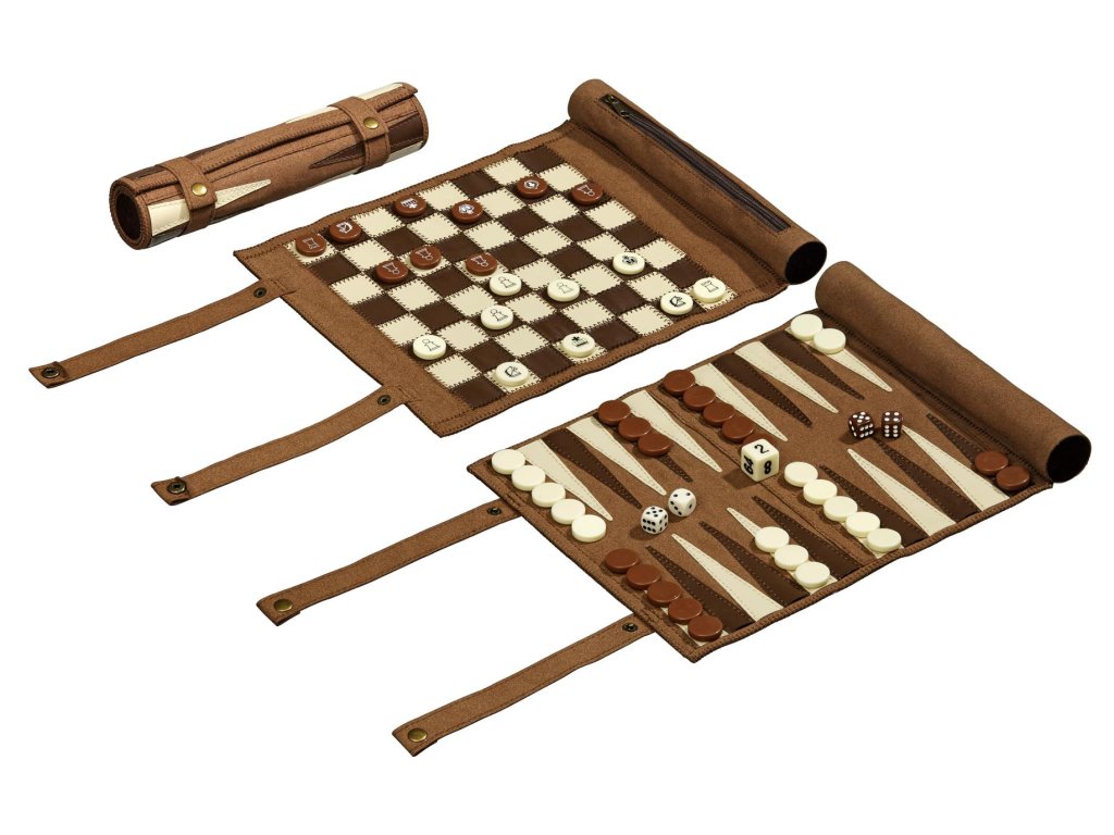 Drei Spieleset - Schach, Dame und Backgammon - in einer interessanten Verpackung, die sich sowohl für das Spielen zu Hause als auch für Reisen und Urlaub eignet.