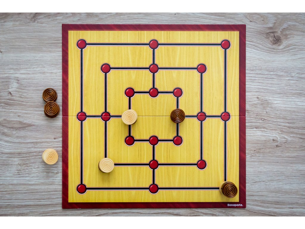 - Mühle - jeder Spieler hat neun Steine, die sich den 24 Kreuzungen entlang bewegen. Wie beim Damespiel geht es darum, dem Gegner alle Steine wegzunehmen oder ihn an weiteren Zügen zu hindern.