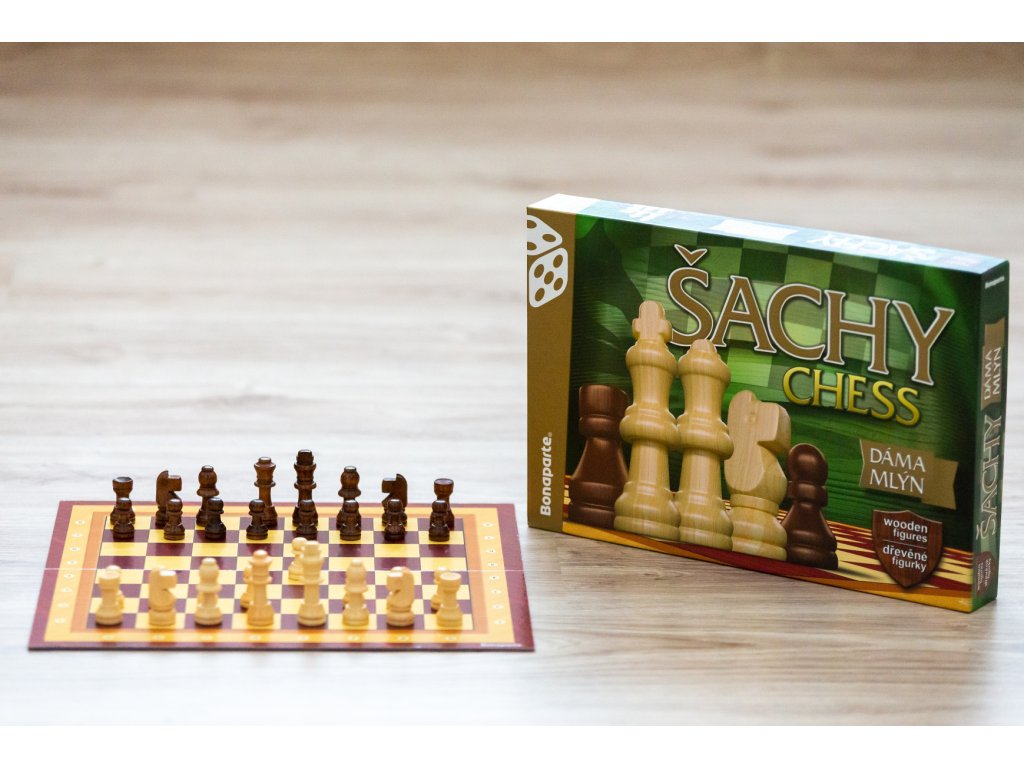 Das Set enthält Schachbrett, 32 Schachfiguren, 24 Steine für Dame und Mühle und eine Anleitung.