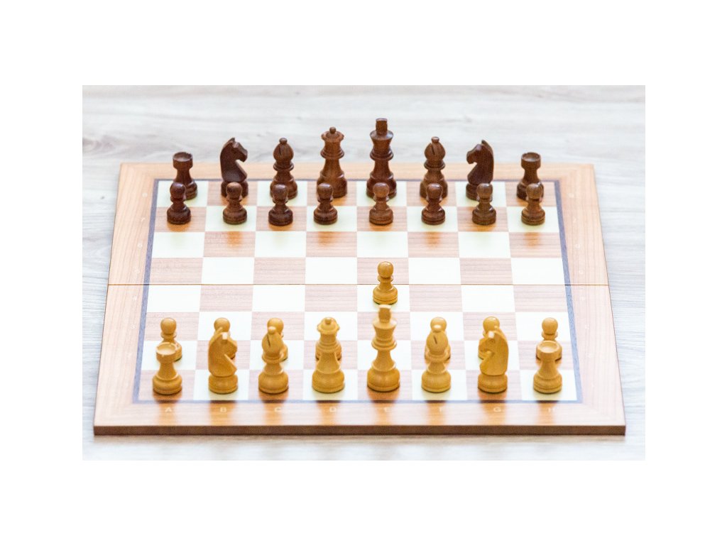 Klappbares Holzschachbrett aus Ahornholz. Das Schachbrett ist mit Notation (Zahlen und Buchstaben) am Rande. Traditionelles Design von Turnierschachfiguren in feiner Ausführung.