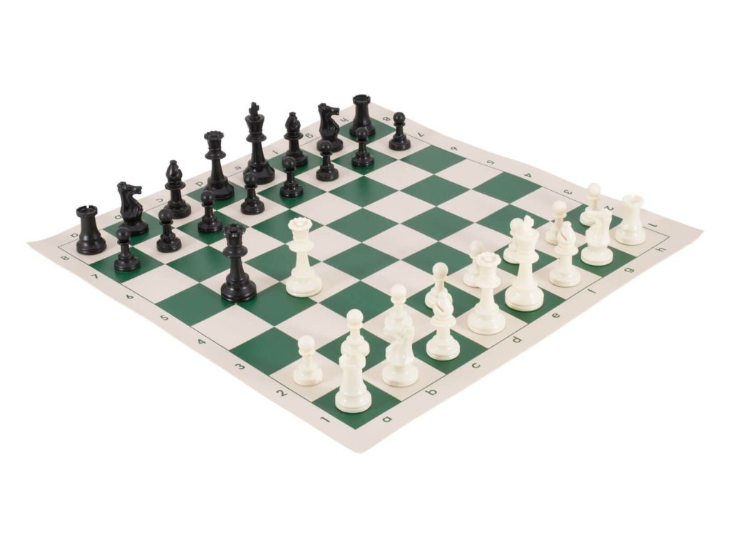 Rollbares Schachbrett grün, Schachfiguren + zwei Ersatzdamen
