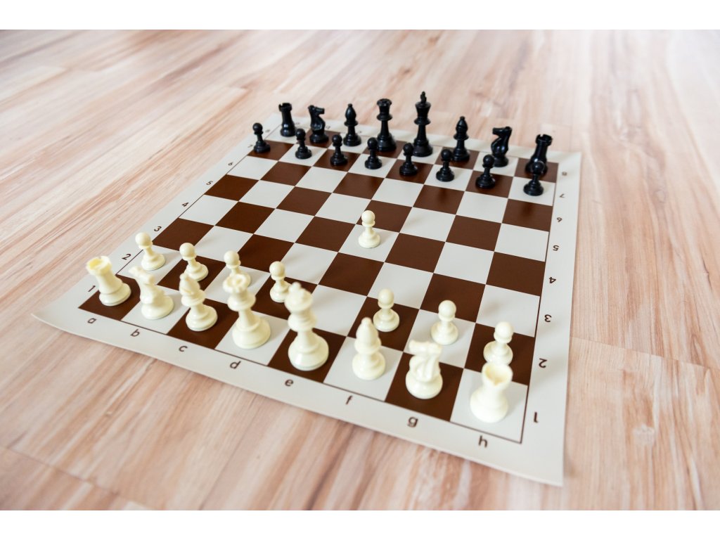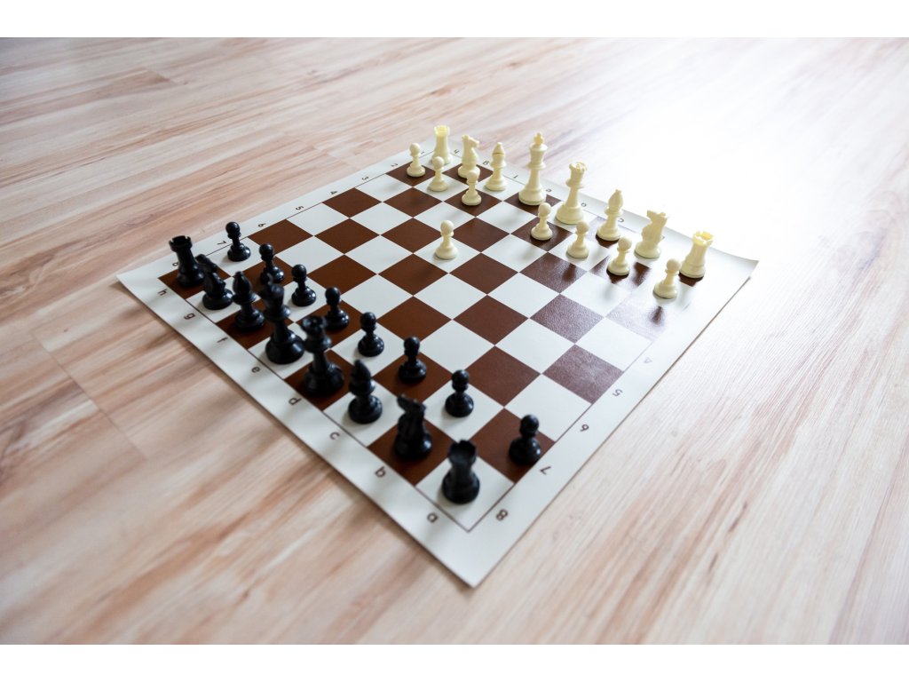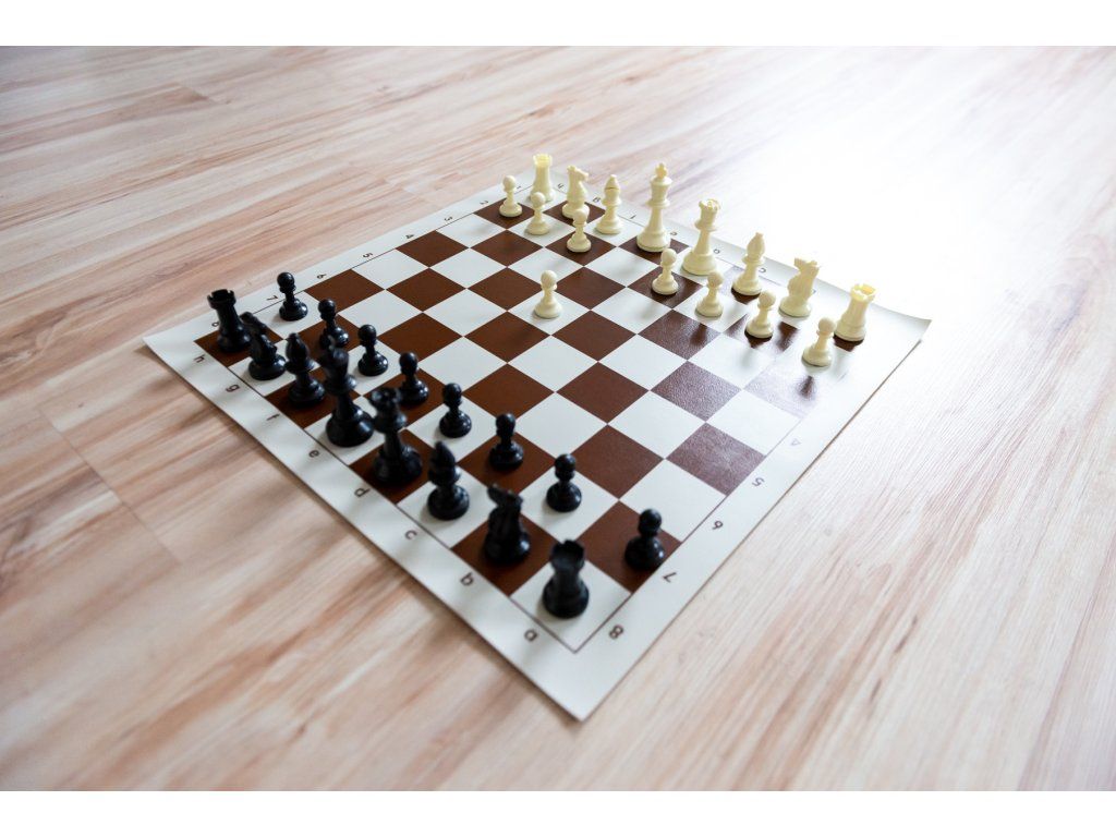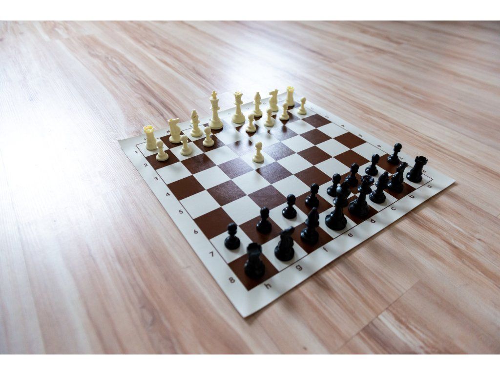 Rollbares Schachbrett braun, Schachfiguren mittelgroß