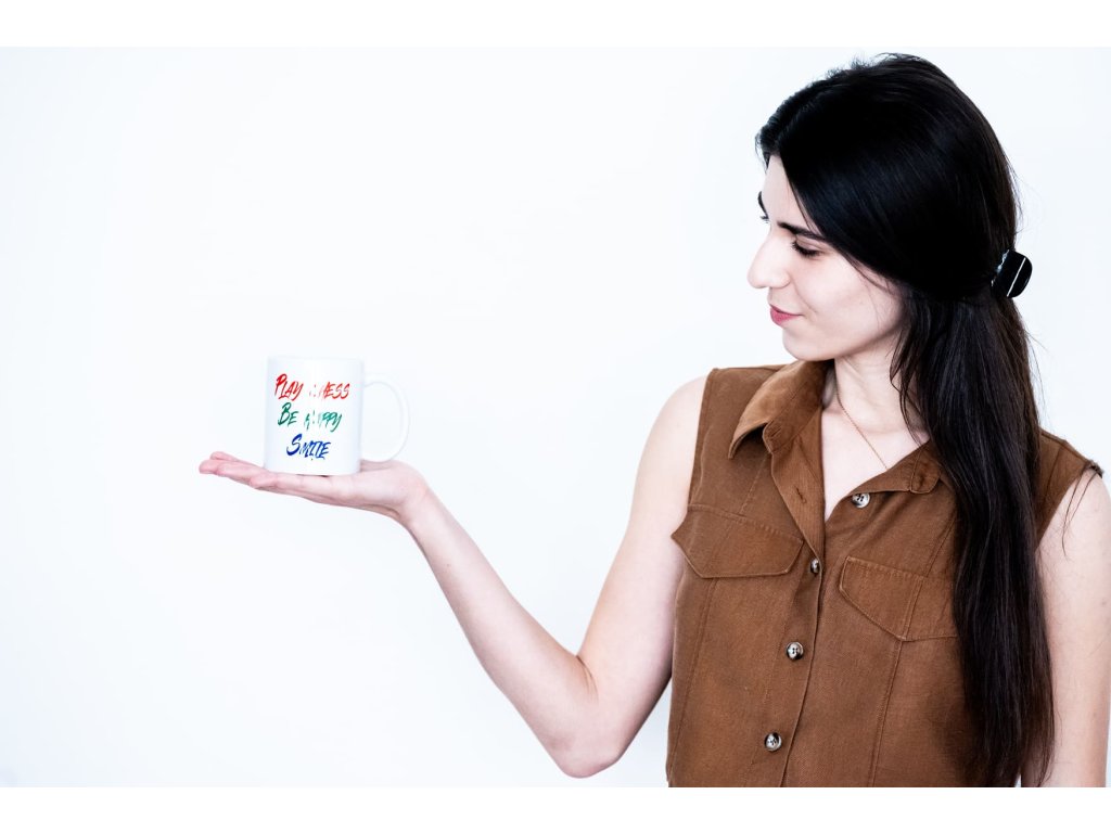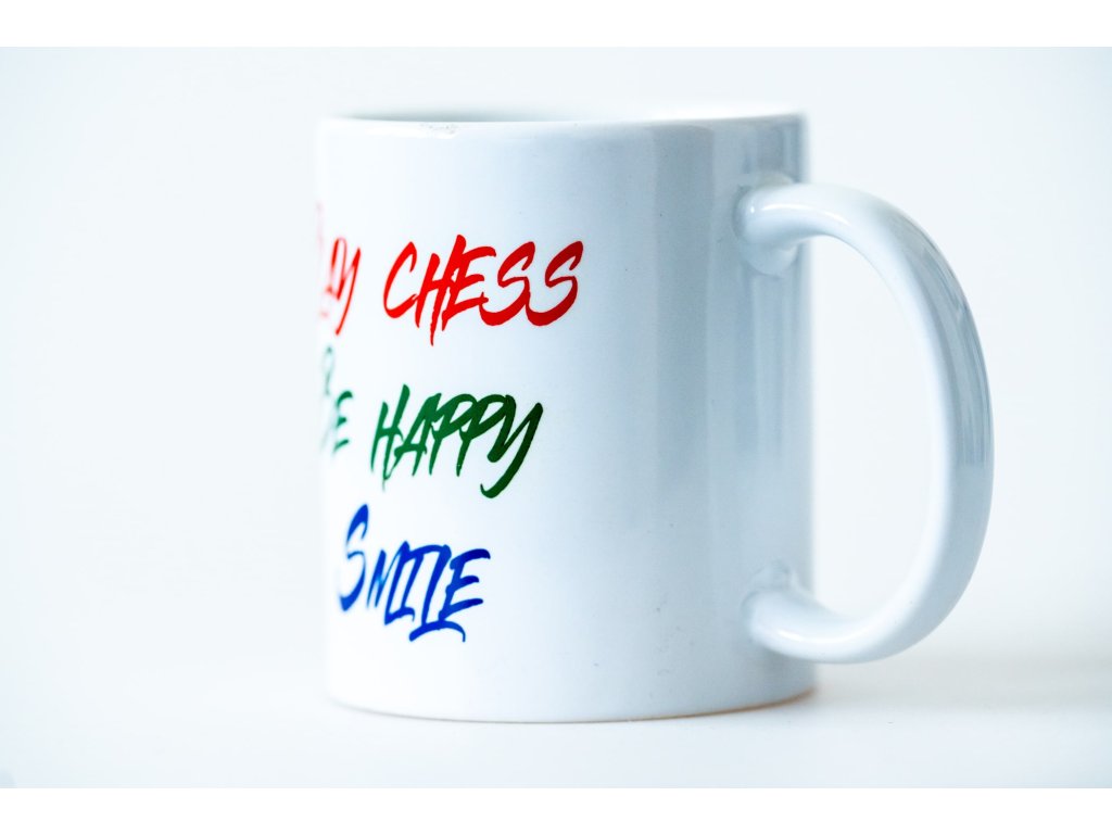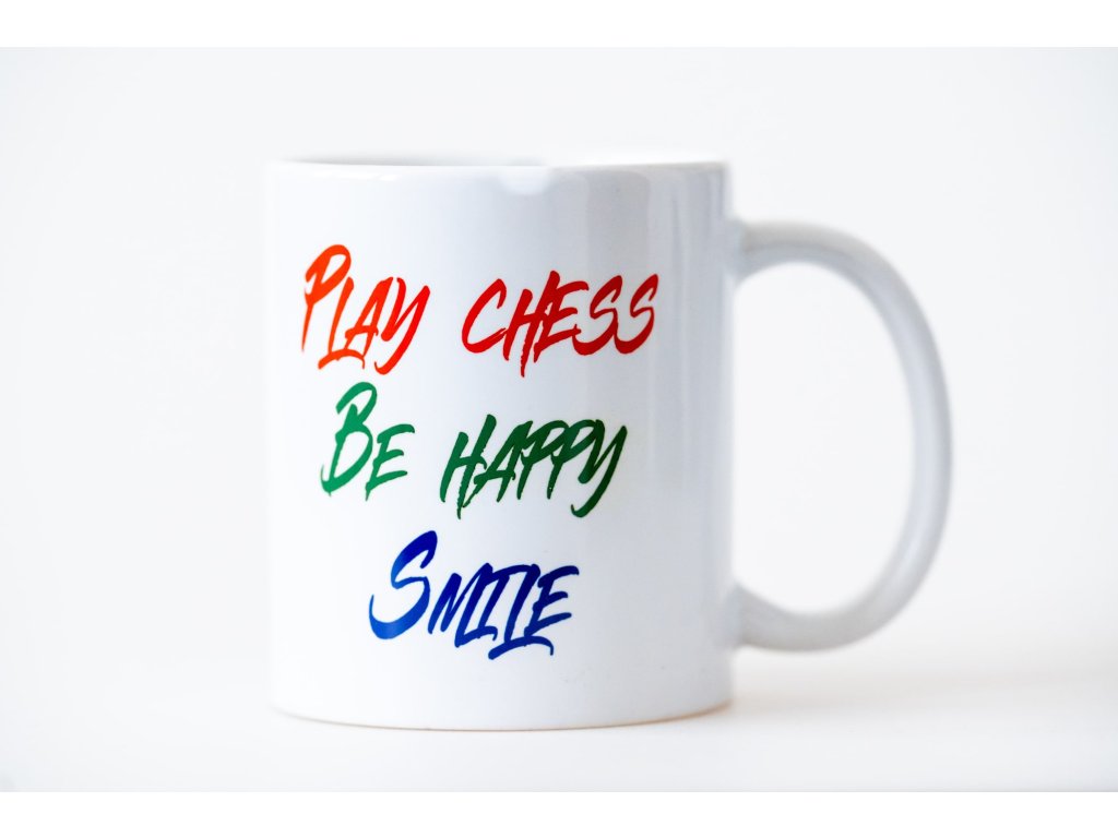 Keramikbecher bedruckt mit Play chess, Be happy, Smile, aus dem Sie Tee oder Kaffee bei einer Schachpartie oder einfach so, in freien Momenten genießen können...