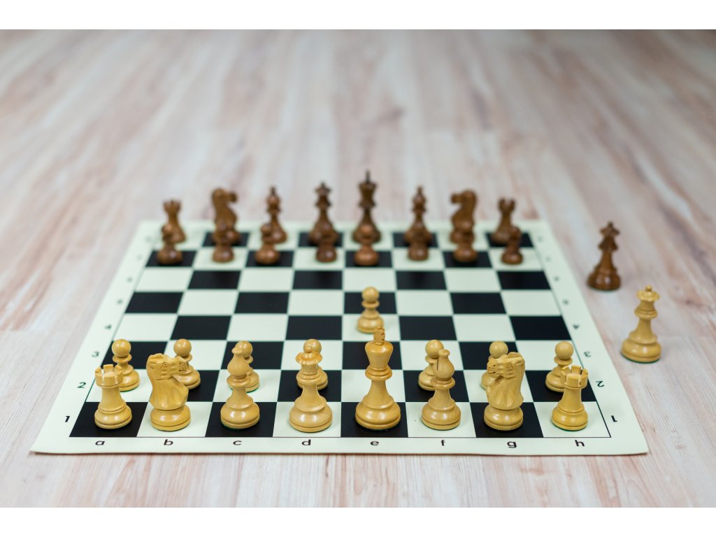 Eine beliebte Version der Staunton-Figuren in luxuriöser Ausführung aus Akazienholz, gewichtet mit einer weichen Unterlage in einer Standard-Wettkampfgröße. Königshöhe : 8,9 cm