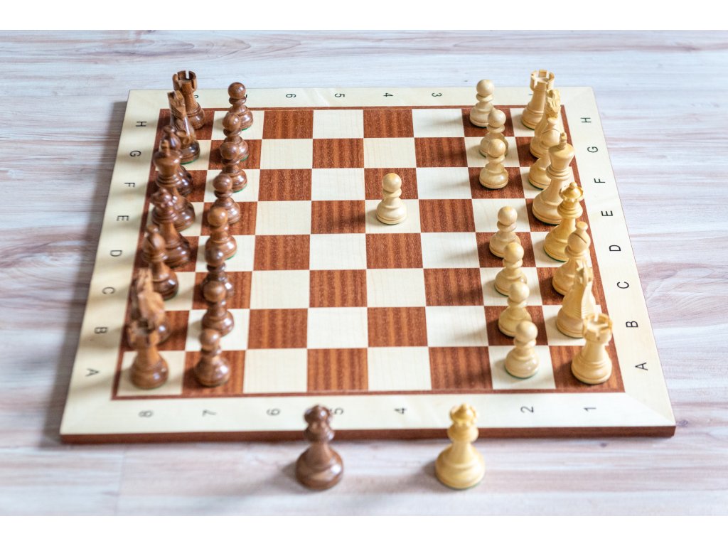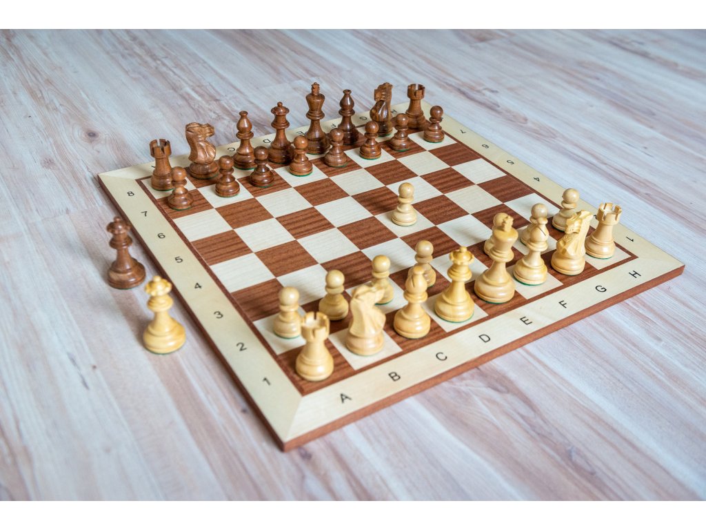 Das Schachbrett aus Mahagoniholz ist mit Randbeschriftung. Die Unterseite des Schachbretts ist mit einer weichen Unterlage versehen, die ein geräuschloses Spielen ermöglicht und Abrieb verhindert.