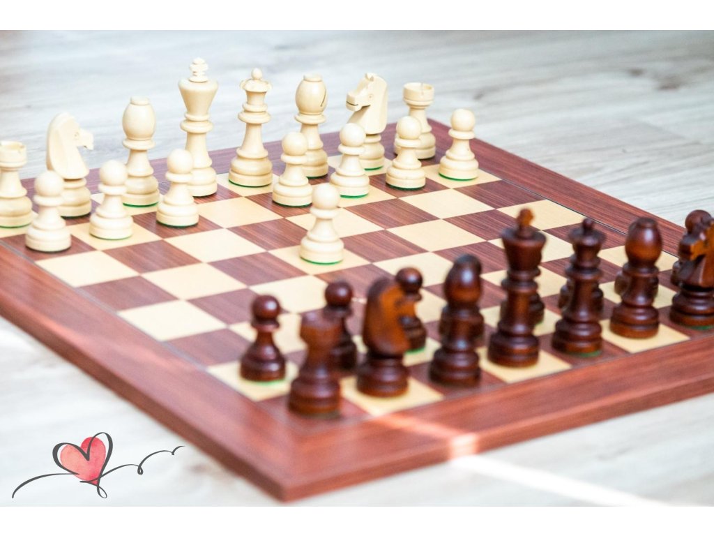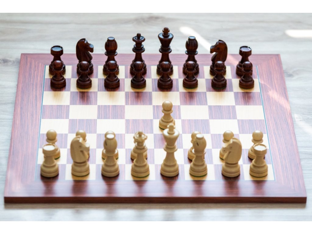 Schachbrett aus Rosenholz und Ahornholz. Beliebte Schachfiguren im Staunton-Stil.