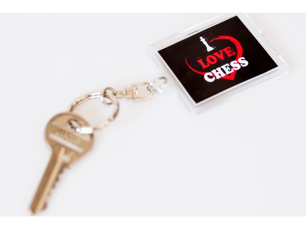 Ein praktischer Schlüsselanhänger mit Metallring. Das Motiv I love chess ist doppelseitig.
